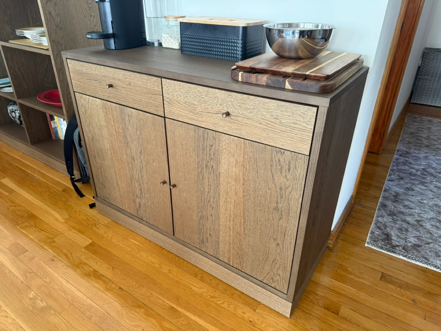 TONSTAD sideboard in brown stained oak veneer. It measures 47 1/2 x 18 5/8 x 35 3/8 inches. This piece offers two drawers and two cabinet doors for storage.