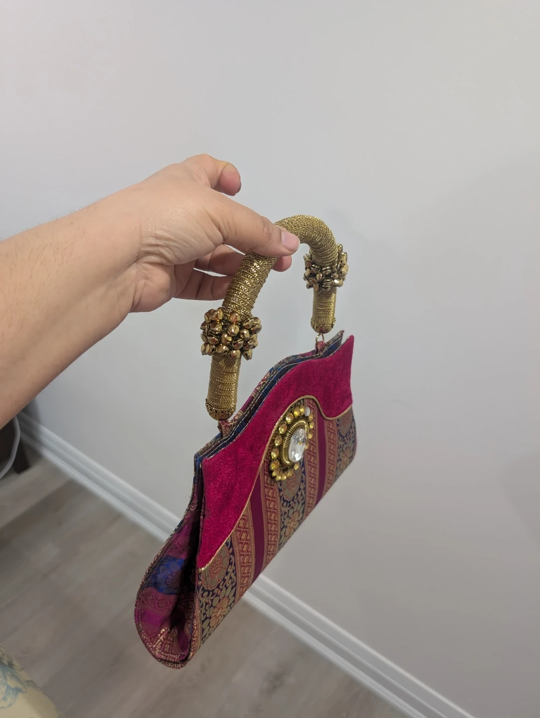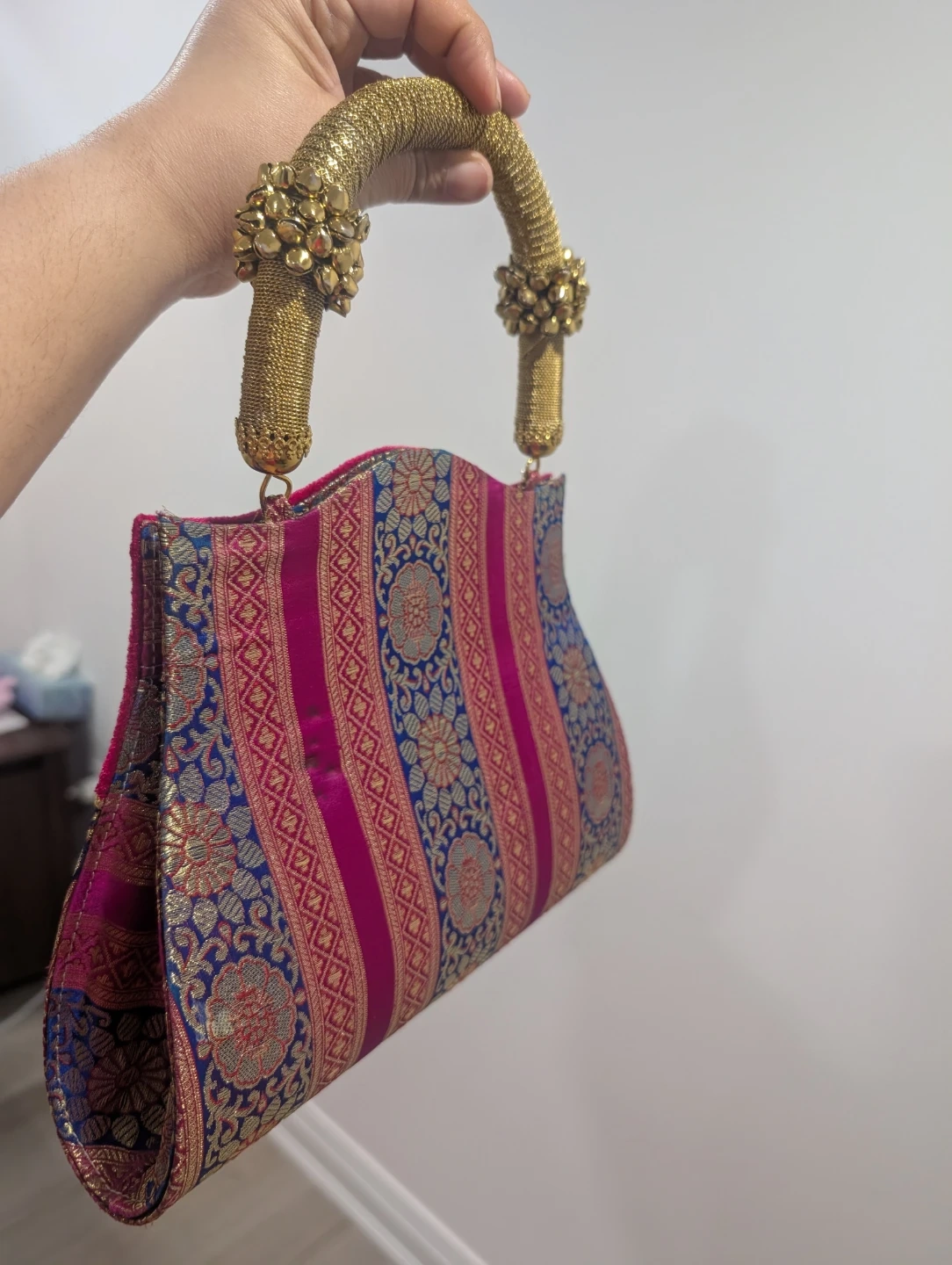 This eye-catching clutch features a rich magenta velvet top panel with a decorative jewel and gold thread detailing. The lower portion displays a vibrant woven fabric with intricate floral and geometric patterns in gold, blue, and pink. It has distinctive golden rope handles adorned with beaded accents. This bag's unique design makes it a statement piece for special occasions.