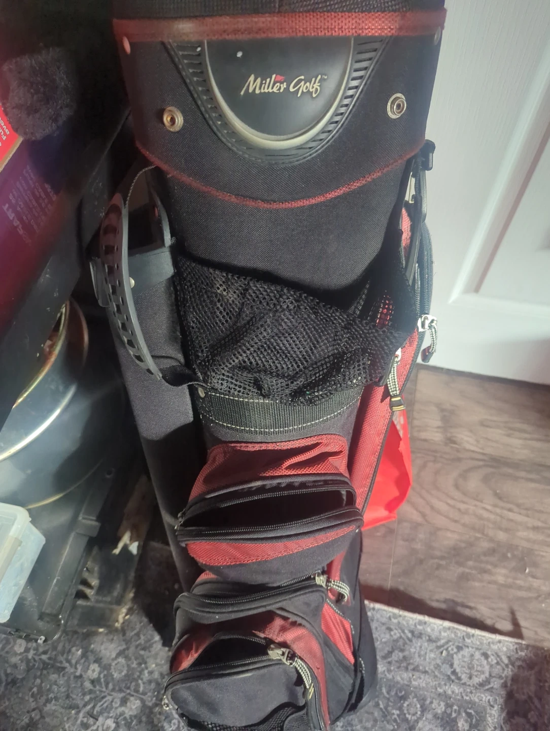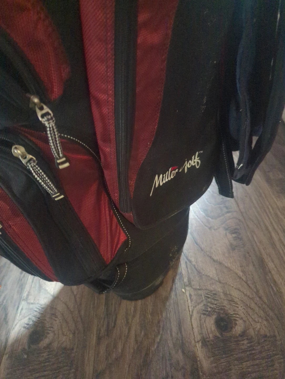 This is a Miller Golf bag filled with various golf clubs. It has multiple pockets for storage. Clubs include irons and a driver. Ready for the course!