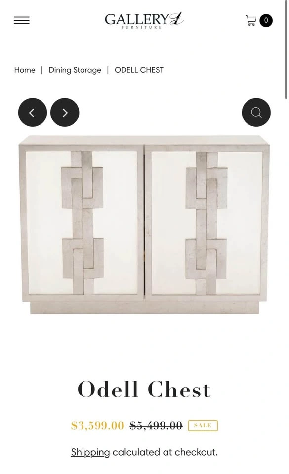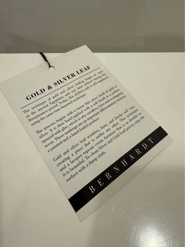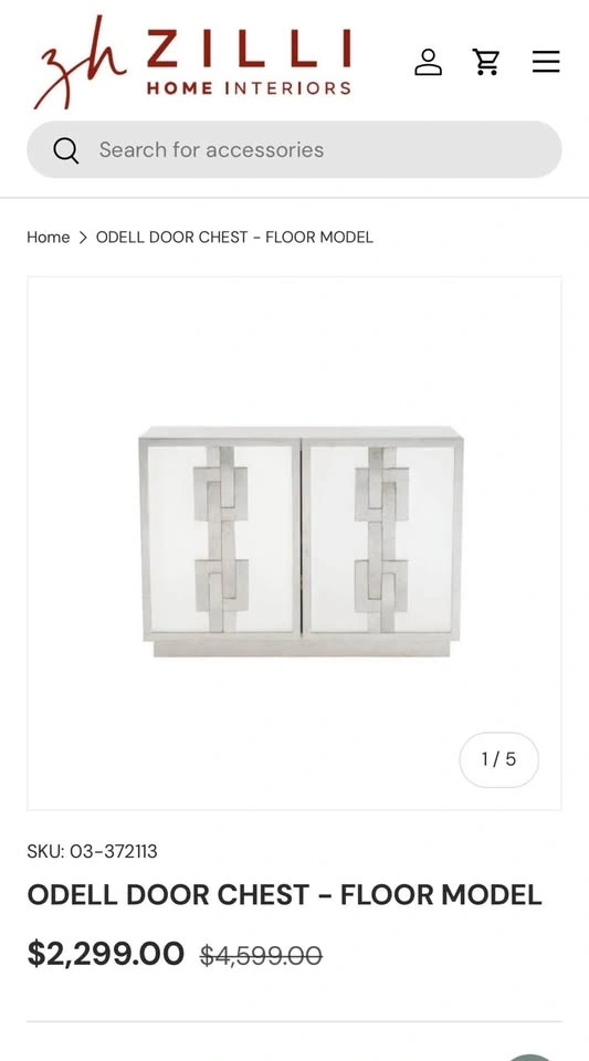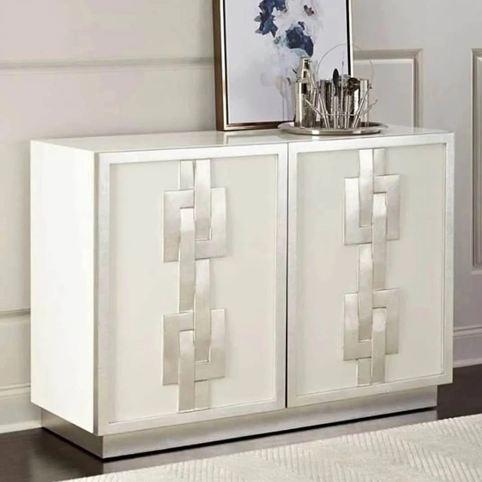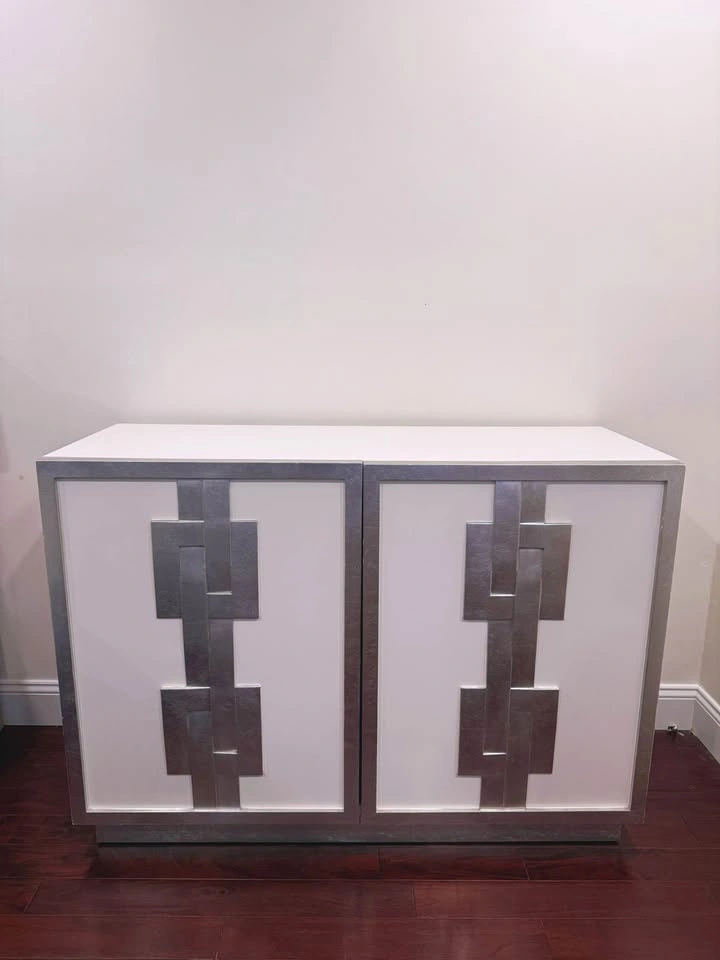 Luxury Bernhardt rectangular door chest. This Odell model features a White Lacquer case, Silver Leaf on frame and base, and on cast resin link design overlay on doors. Concealed soft-closing hinges on doors. Behind two doors is one adjustable/removable shelf and back panel with covered grommet for wire management. Retails for $4599. Zilli’s used floor model is $2299. Selling this for $2500 Dimensions: 48" W x 18" D x 34" H