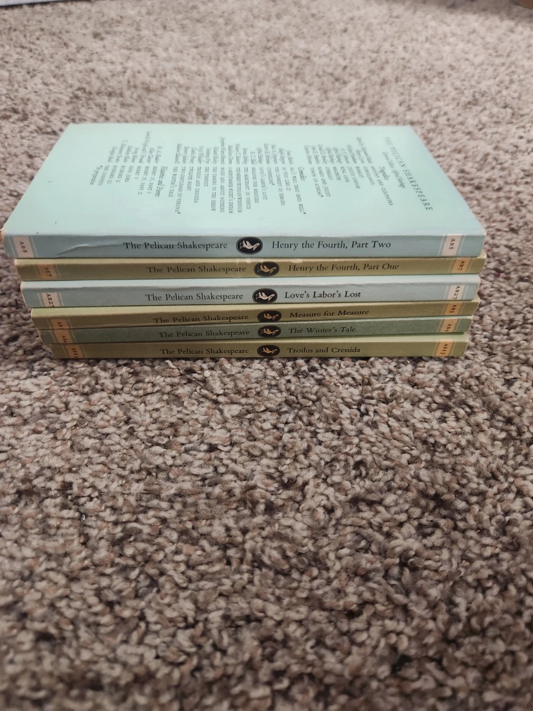 This is a set of six books from The Pelican Shakespeare series. The collection includes: Henry IV, Part One; Henry IV, Part Two; Love's Labour's Lost; Measure for Measure; The Winter's Tale; and Troilus and Cressida. These books are paperbacks with a consistent design.