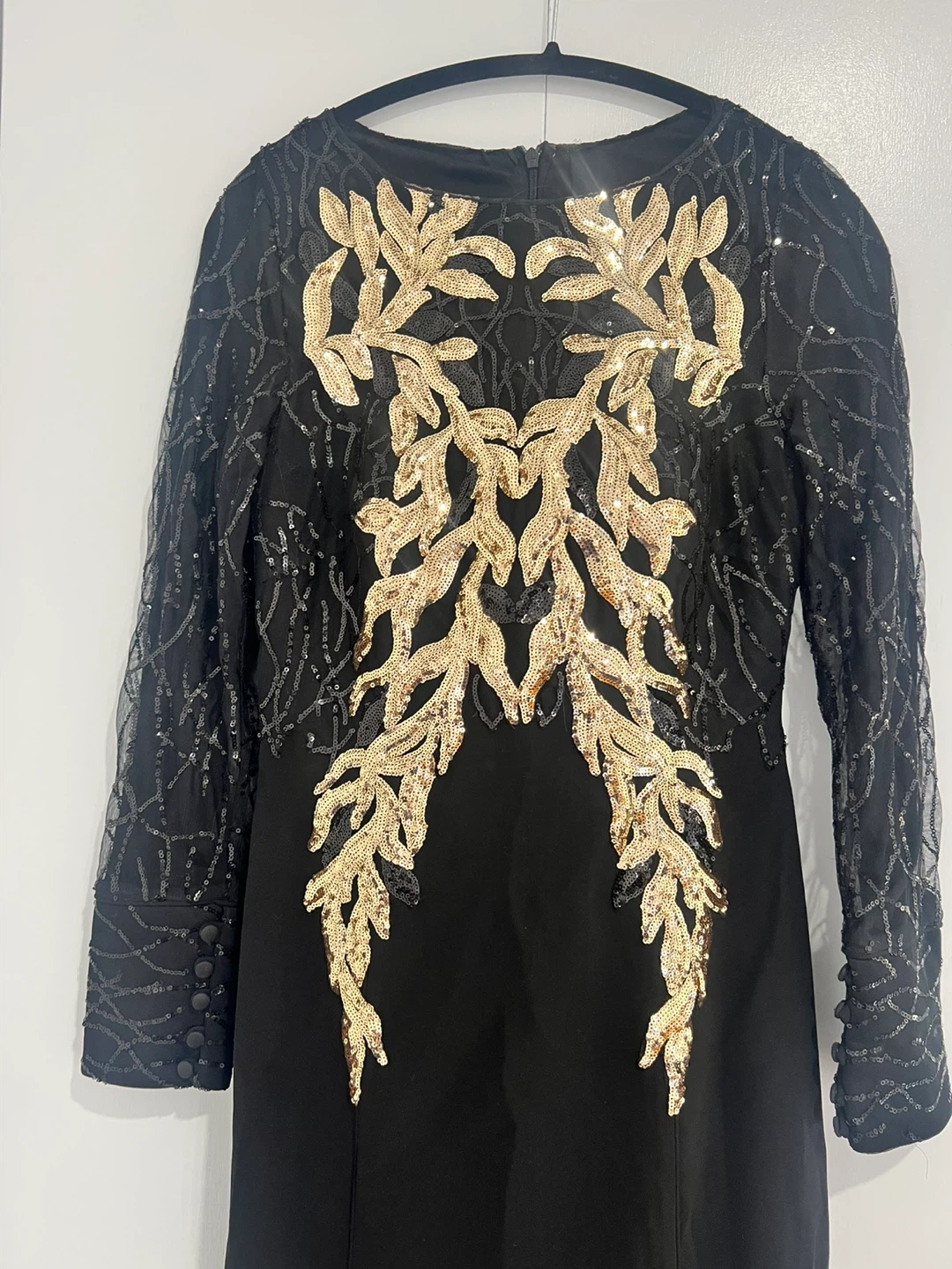 Beautiful black formal gown with gold embellishments! The dress features long sleeves and a fitted silhouette. Perfect for a special occasion!