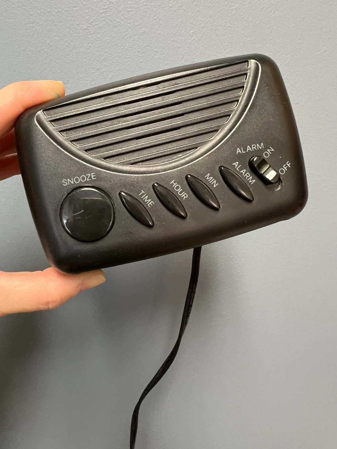 A black Cosmo digital alarm clock. It features a snooze button, time, hour, and minute setting controls. It also has an alarm on/off switch.