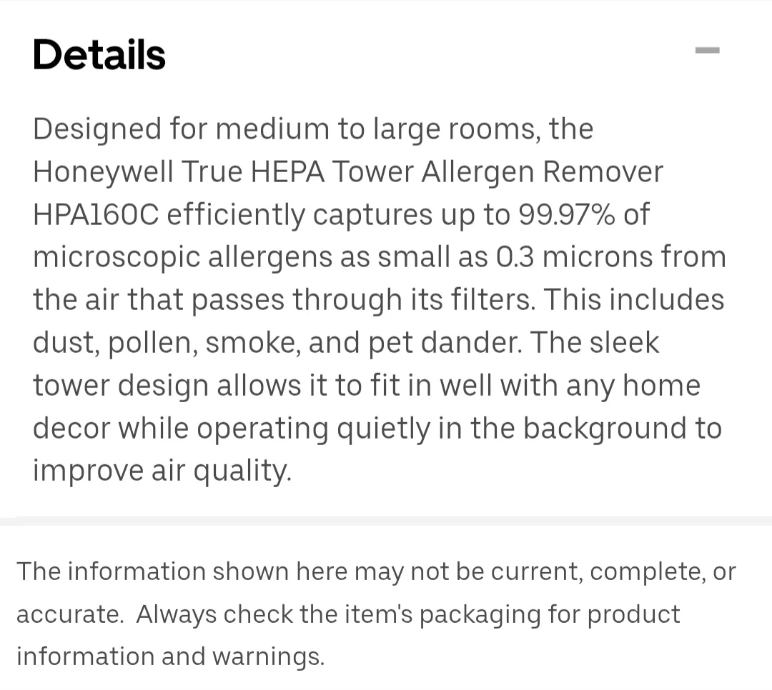 Honeywell Tower Allergen Remover HPA160C. Captures up to 99.97% of microscopic allergens as small as 0.3 microns, including dust, pollen, smoke, and pet dander. Designed for medium to large rooms.