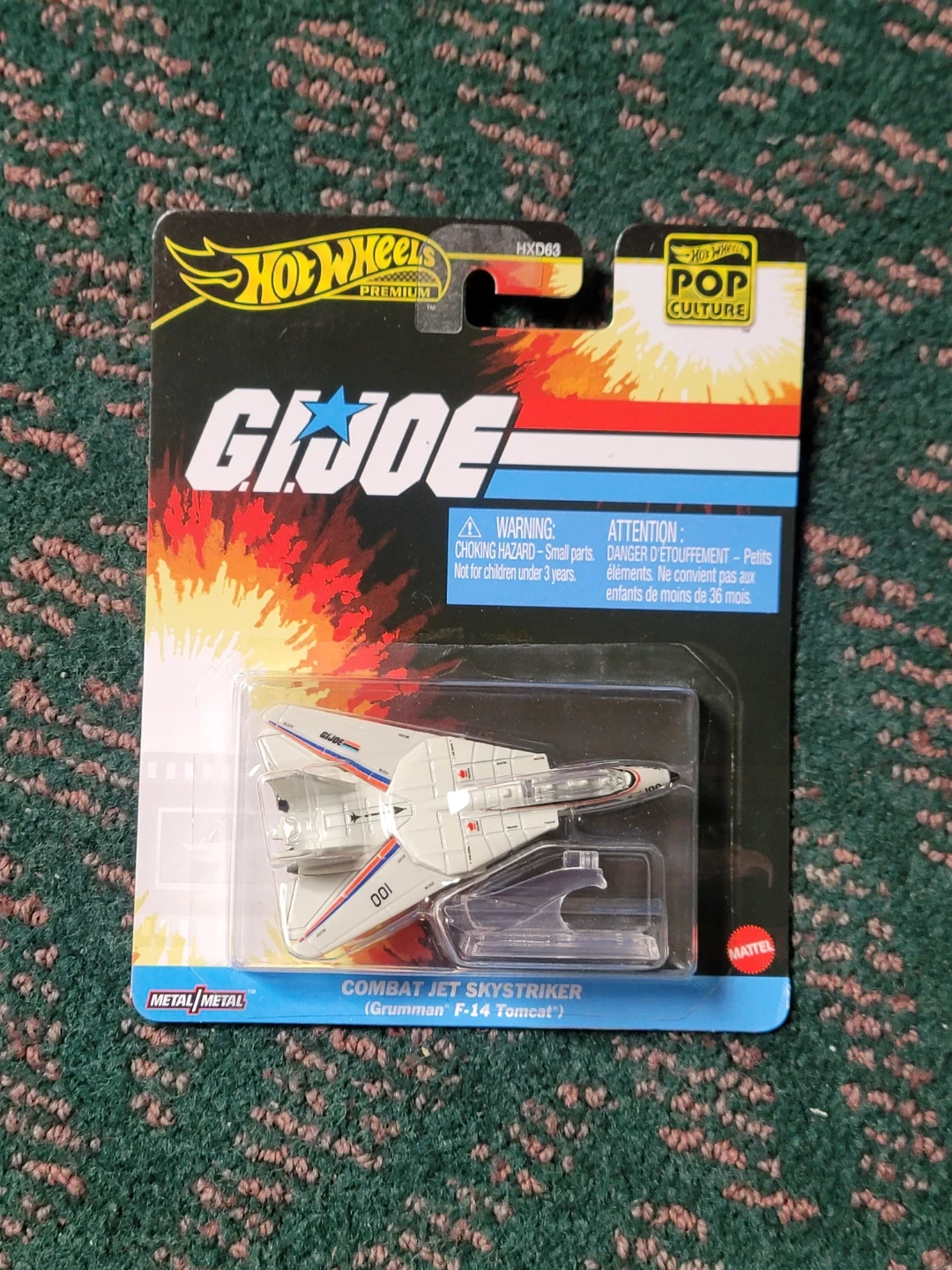 Hot Wheels Premium "Pop Culture" collection G.I. Joe "Combat Jet Skystriker" (Grumman F-14 Tomcat). Die-cast metal body with plastic parts. Comes in original packaging with display stand. This is a collector's item for G.I. Joe and fighter jet enthusiasts!
