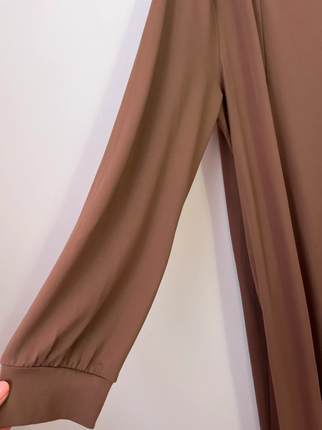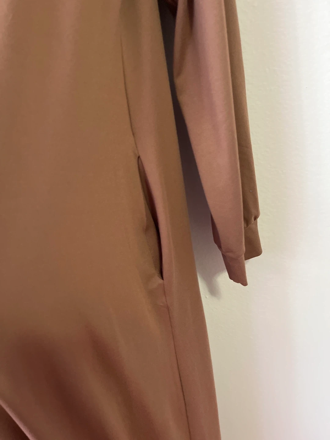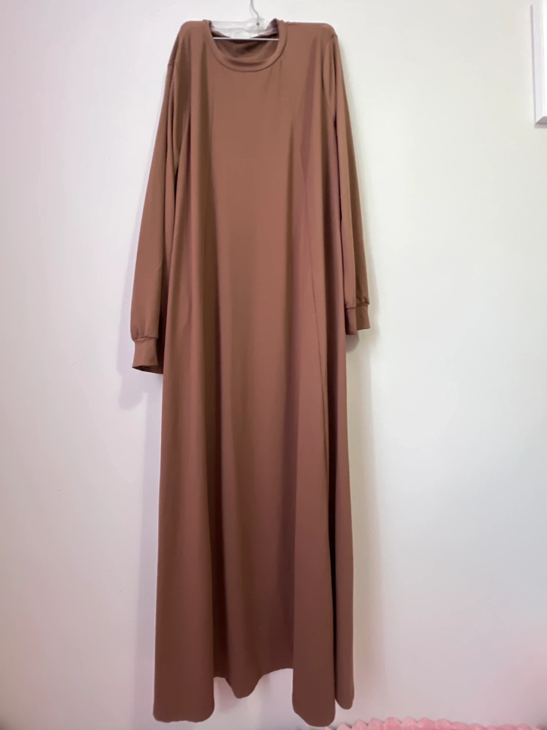 This is a comfortable brown maxi dress with long sleeves. It features convenient side pockets for your essentials. The fabric is soft and flowing, making it perfect for everyday wear.