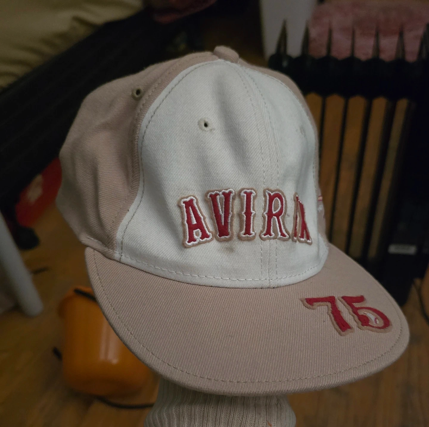 The cap has "AVIREX" embroidered on the front and "75" on the brim. A New York logo is on the side.