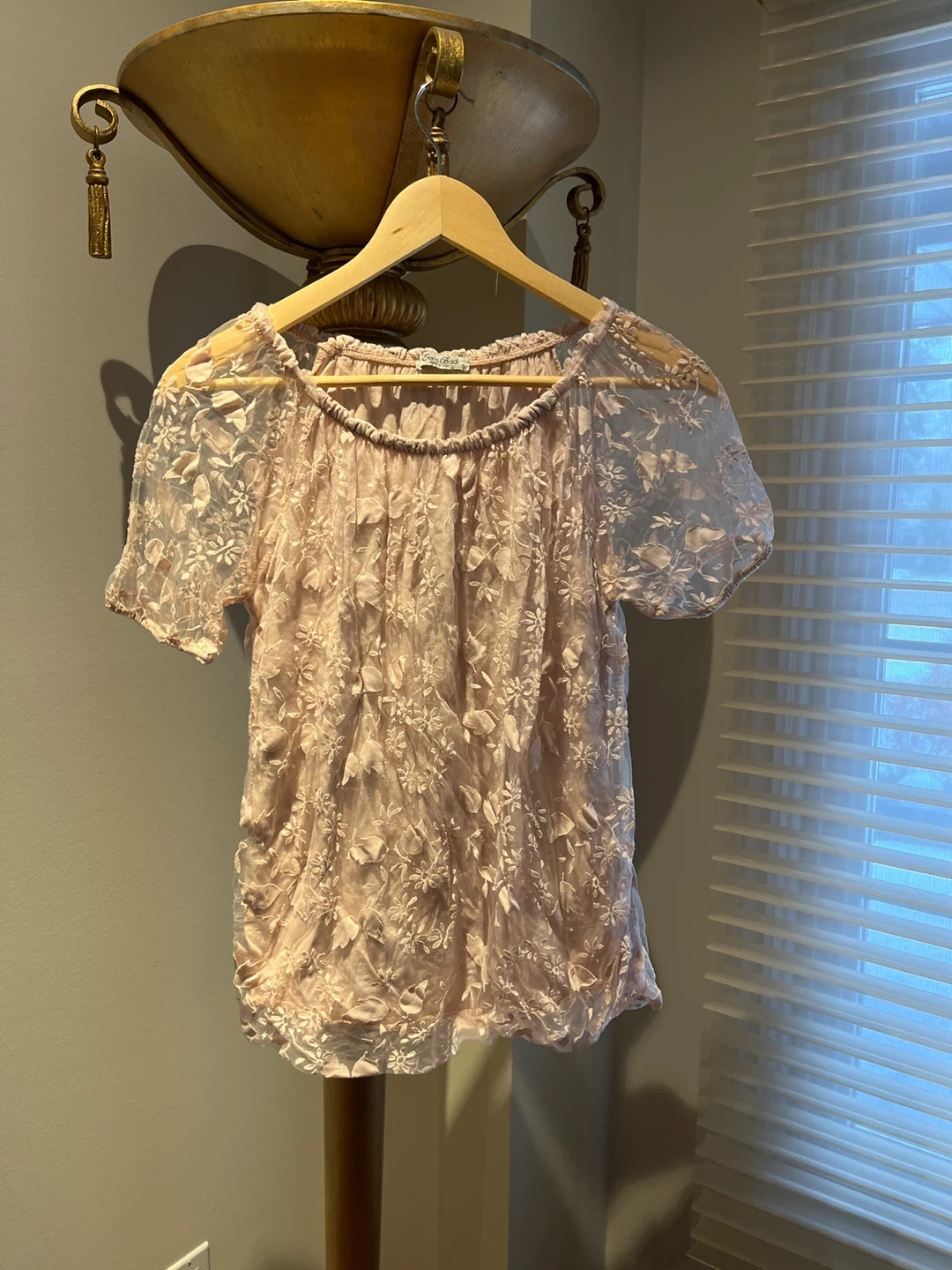 This light pink sheer top is adorned with intricate floral lace detailing all over. It features short sleeves and a gathered neckline for a comfortable fit. It's a beautiful layering piece.