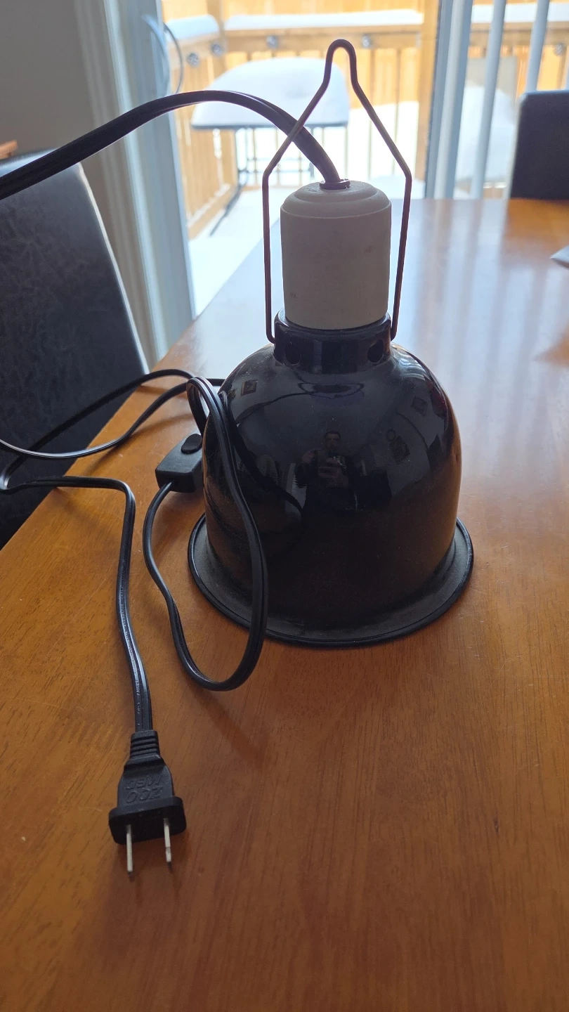 This is a black heat lamp with a built-in on/off switch on the cord. It has a ceramic socket and a metal reflector. Works great for terrariums or other heating needs! Also comes with a hanger attached!