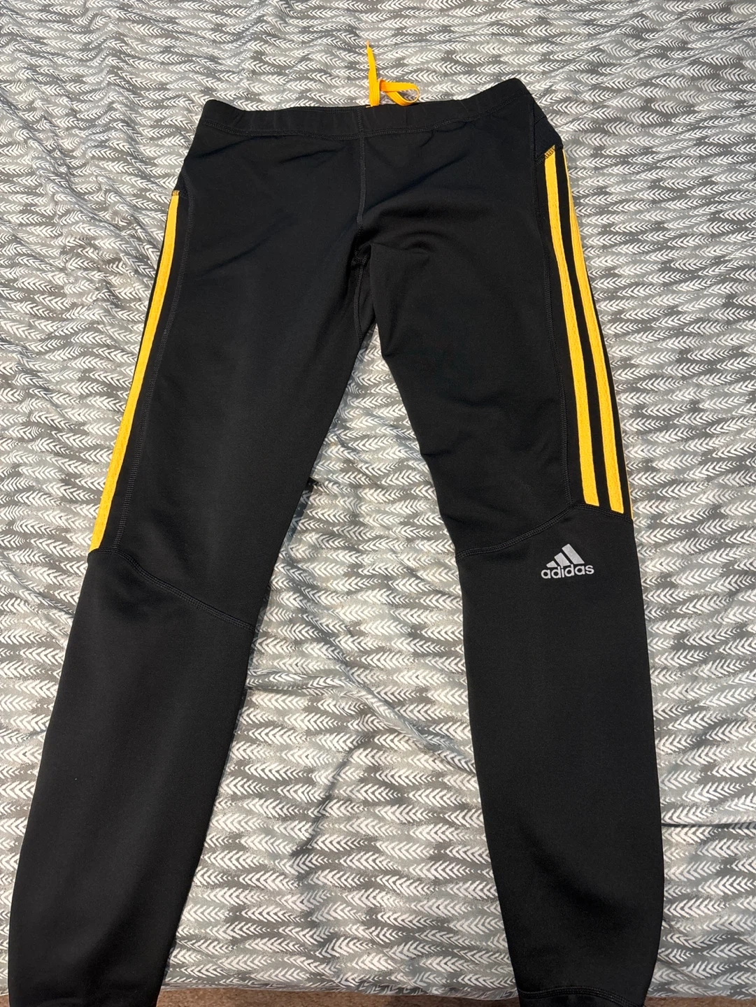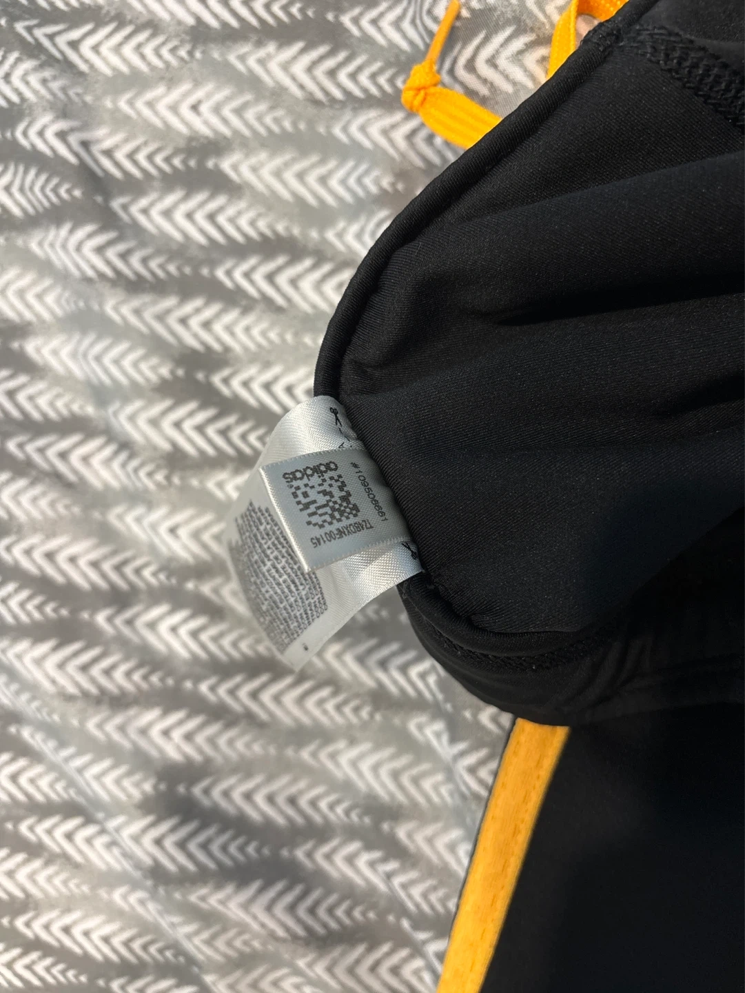 Black Adidas track pants with yellow side stripes and an orange drawstring. These pants feature a zippered pocket on the back. They're made from a lightweight, athletic material.