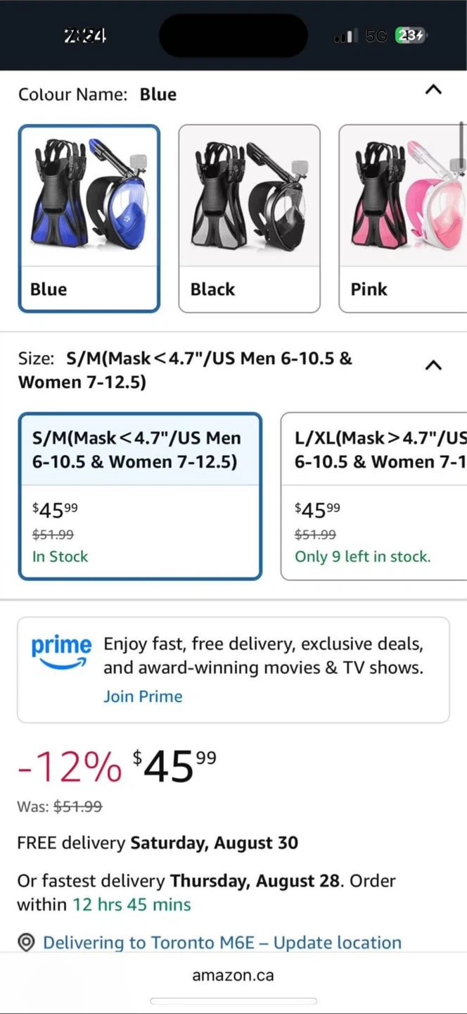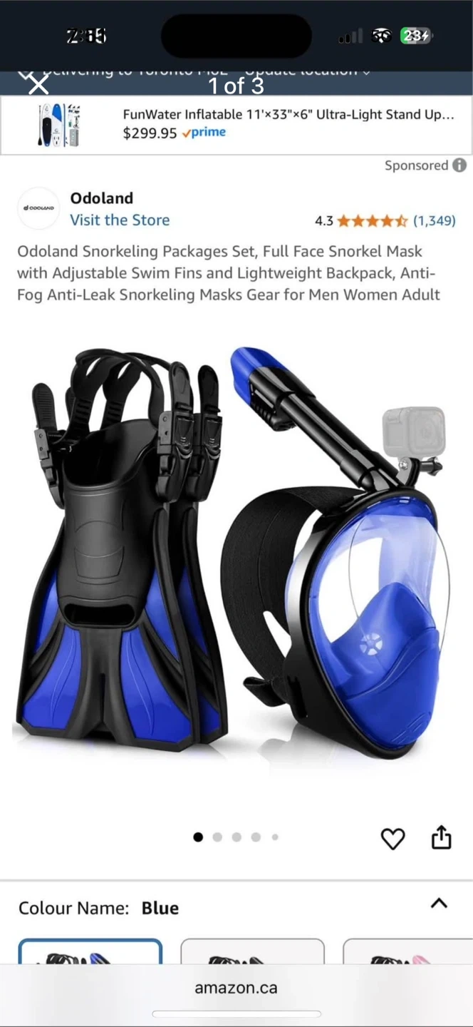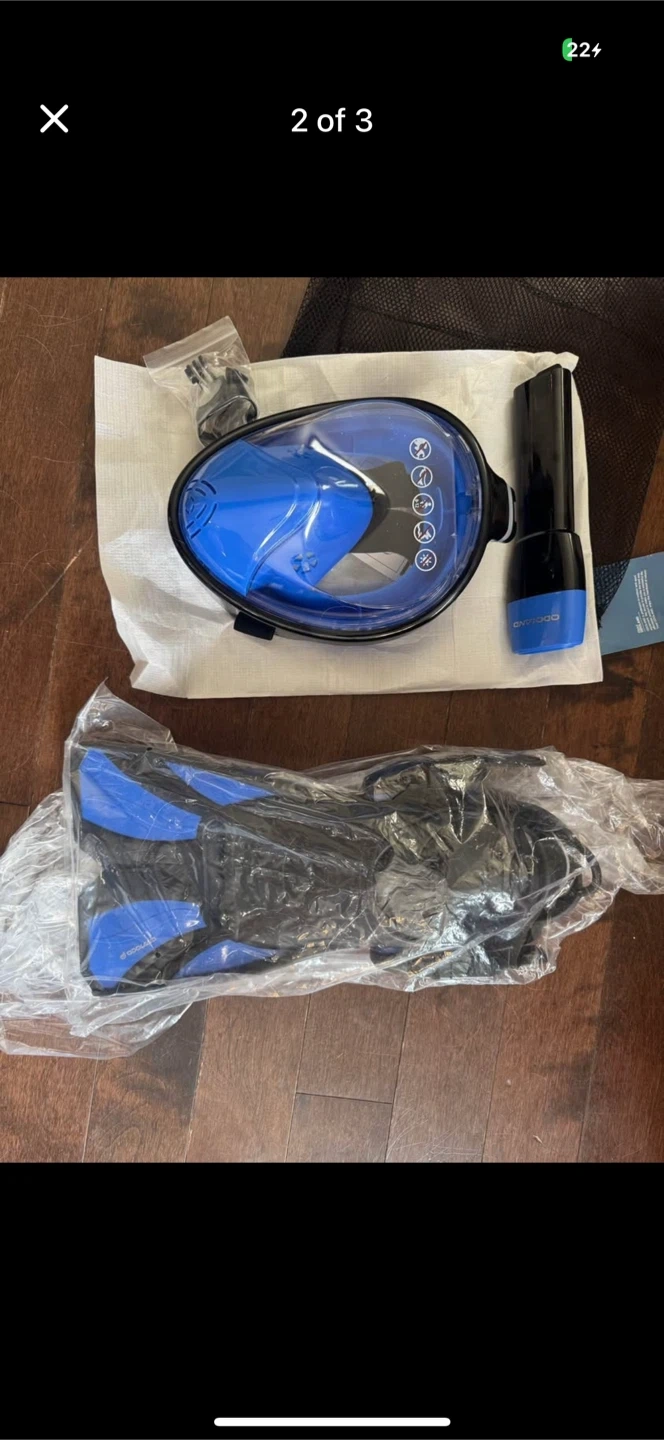 60Get ready for some fun in the water with this Odoland snorkeling set! It includes a full face snorkel mask with adjustable swim fins and a lightweight backpack. The mask size is S/M (Mask <4.7" / US Men 6-10.5 & Women 7-12.5). Colour is Blue