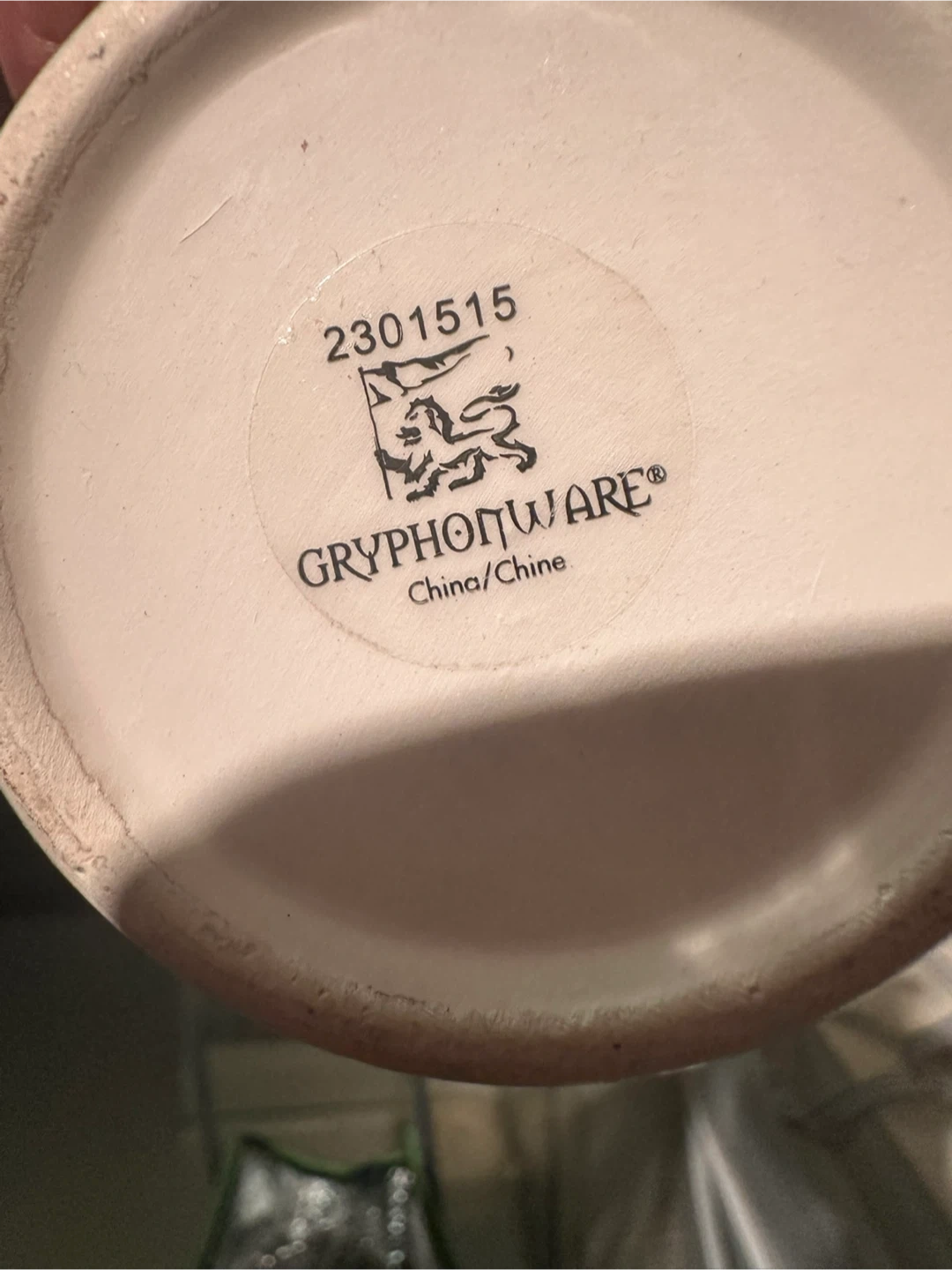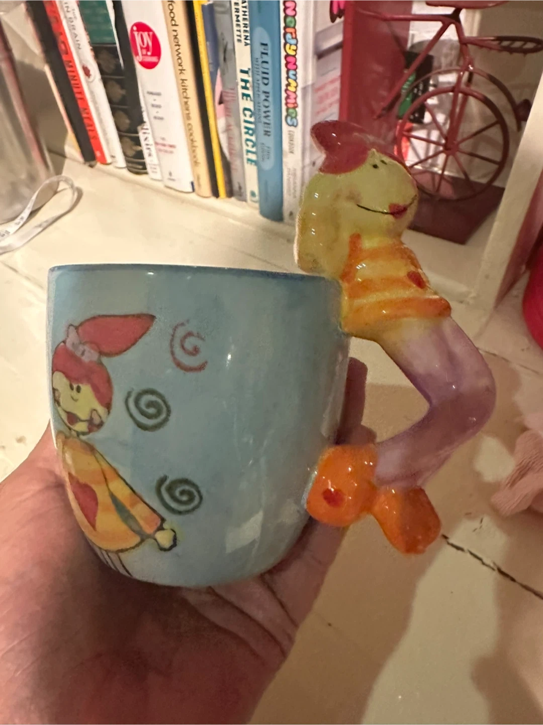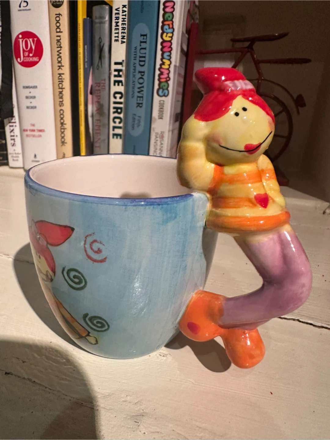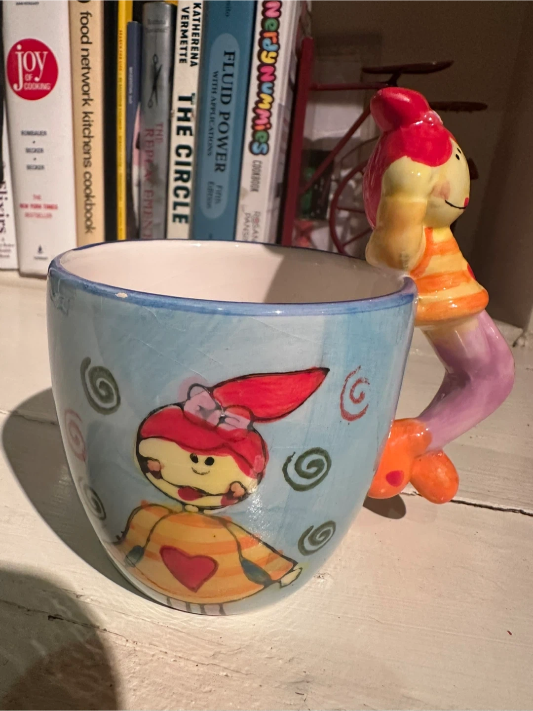 Vintage-style Gryphonware ceramic mug featuring a whimsical sculpted girl handle and colorful hand-painted design. A fun collectible novelty mug perfect for coffee, tea, or display.