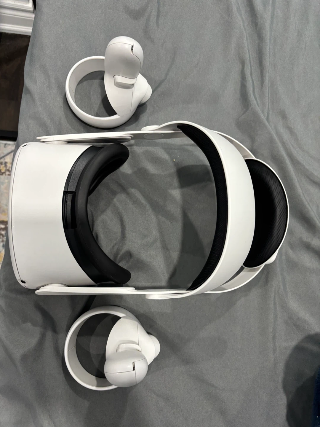 This is a white Meta Quest 2 VR headset. It comes with two controllers for an immersive experience. Includes the headset, head strap, controllers and charger. No batteries (AA batteries)