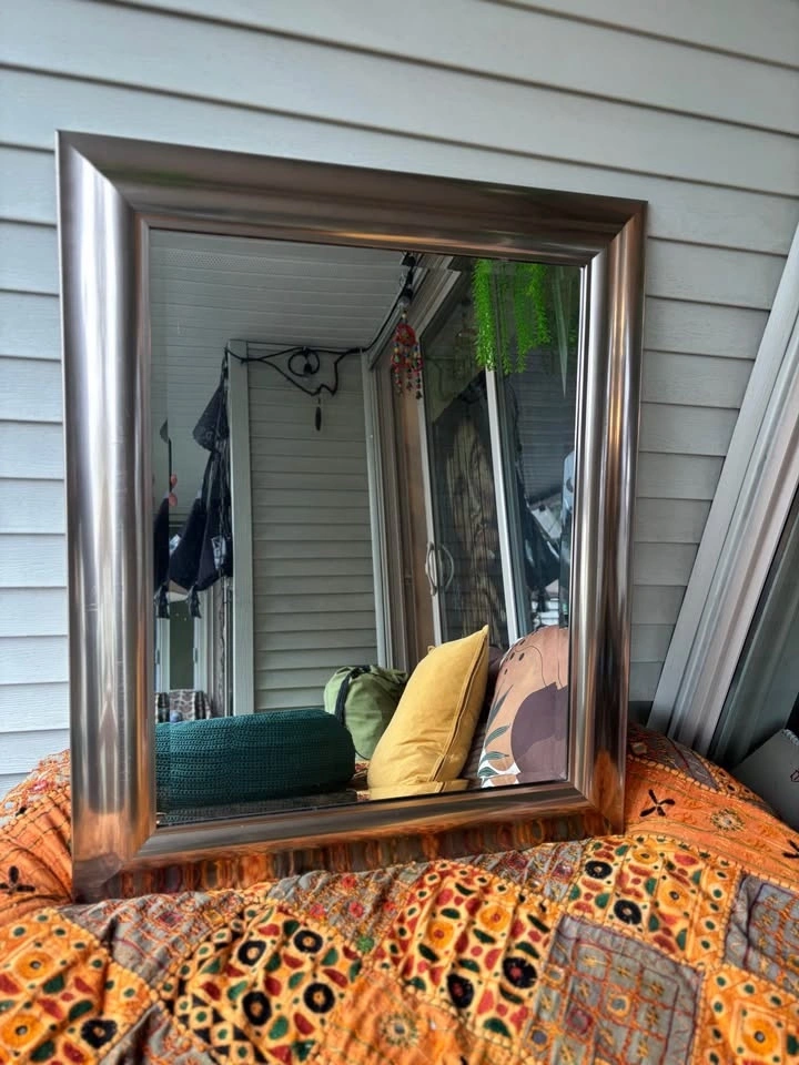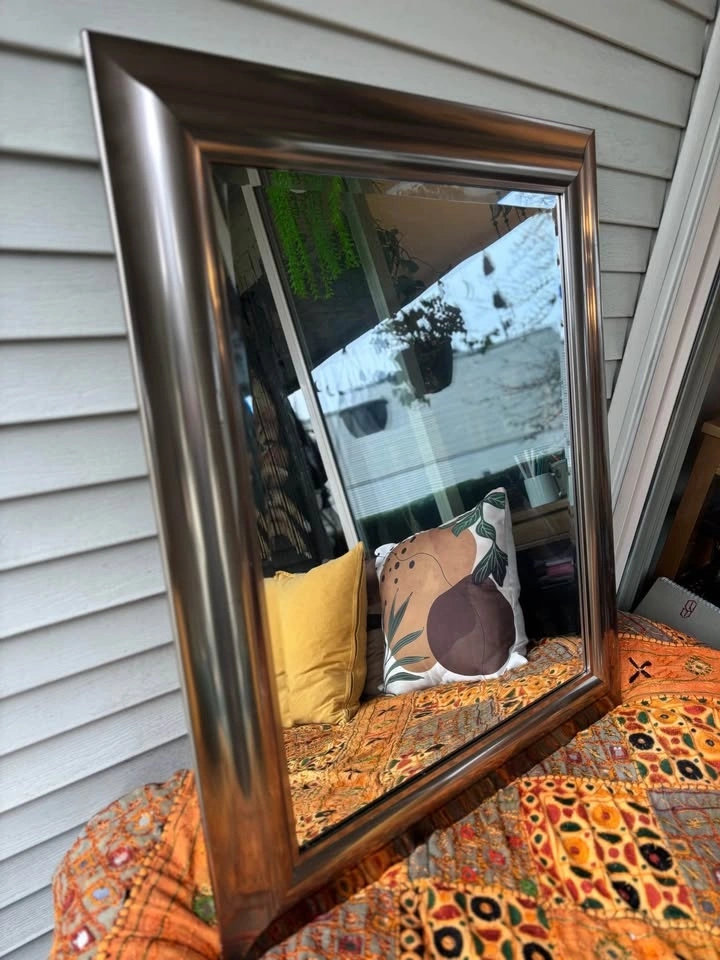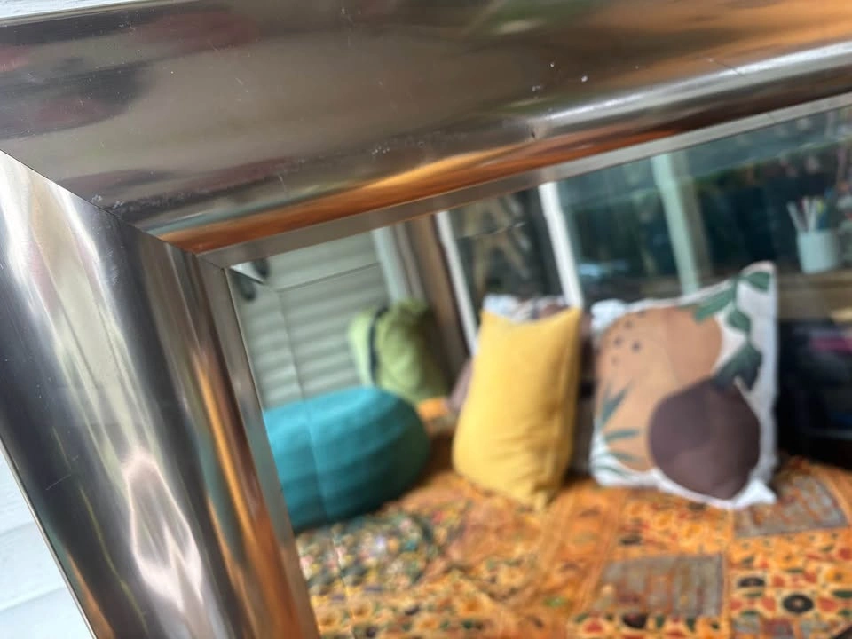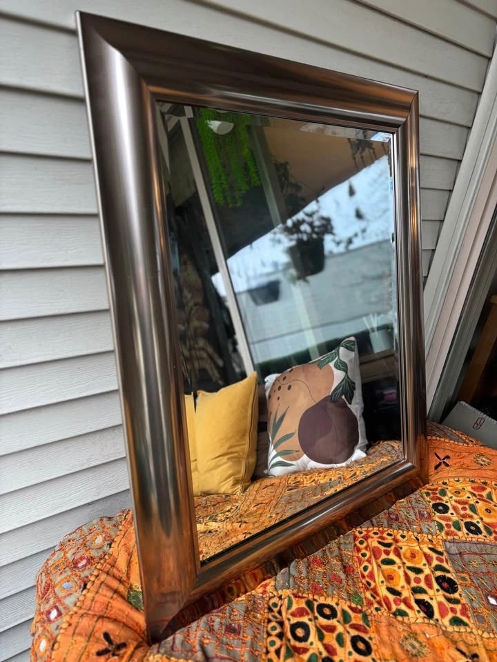 A striking vintage wall mirror featuring a sculptural brushed metal frame with softly rounded edges and a warm, reflective finish. Clean, architectural, and quietly glamorous — this piece brings depth and light without overpowering a space. Approx. 34.5x28.5in. The mirror is Made in Canada, with solid construction and D-ring hardware for secure hanging. The frame has a beautiful satin-metal sheen that catches ambient light subtly, making it ideal for bedrooms, entryways, living rooms, or layered gallery walls. Measurements are shown clearly in the photos for accuracy. There are a few light scuffs consistent with age and gentle use, but nothing distracting — they blend into the brushed finish and are not noticeable once hung. A timeless piece that works effortlessly across styles: modern, mid-century inspired, boho, eclectic, or minimalist interiors. ✨ Vintage charm with real presence ✨ Substantial feel, not flimsy ✨ Clean lines, sculptural profile ✨ Ready to hang. Pick up by Kensington square in North Burnaby or by Parkgate in North Vancouver.