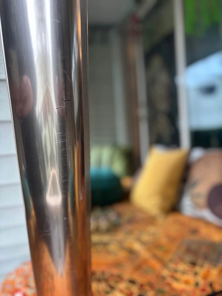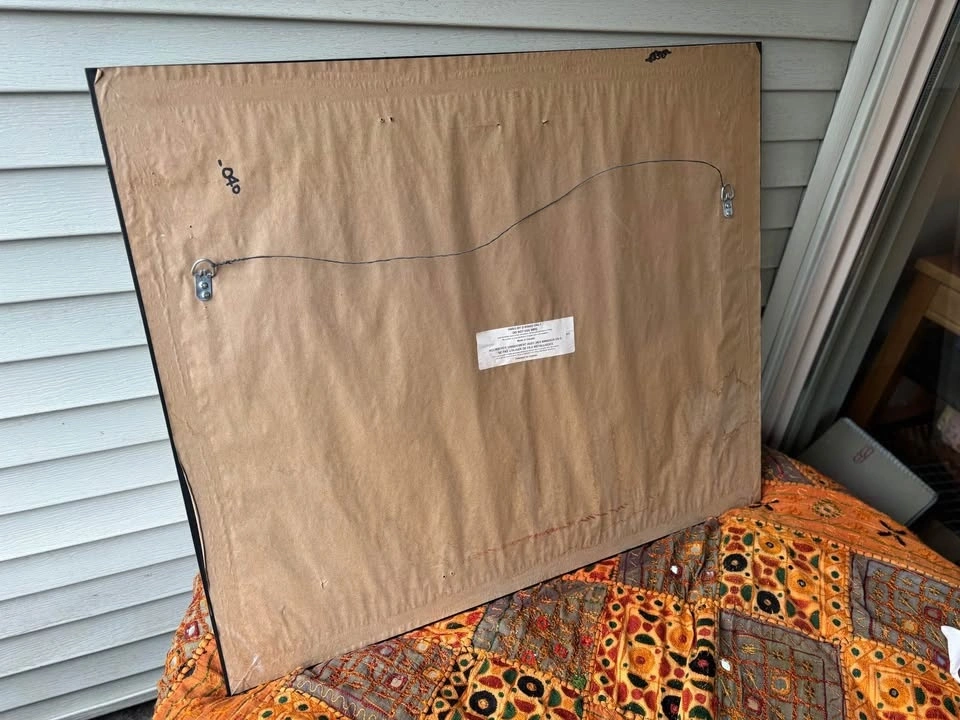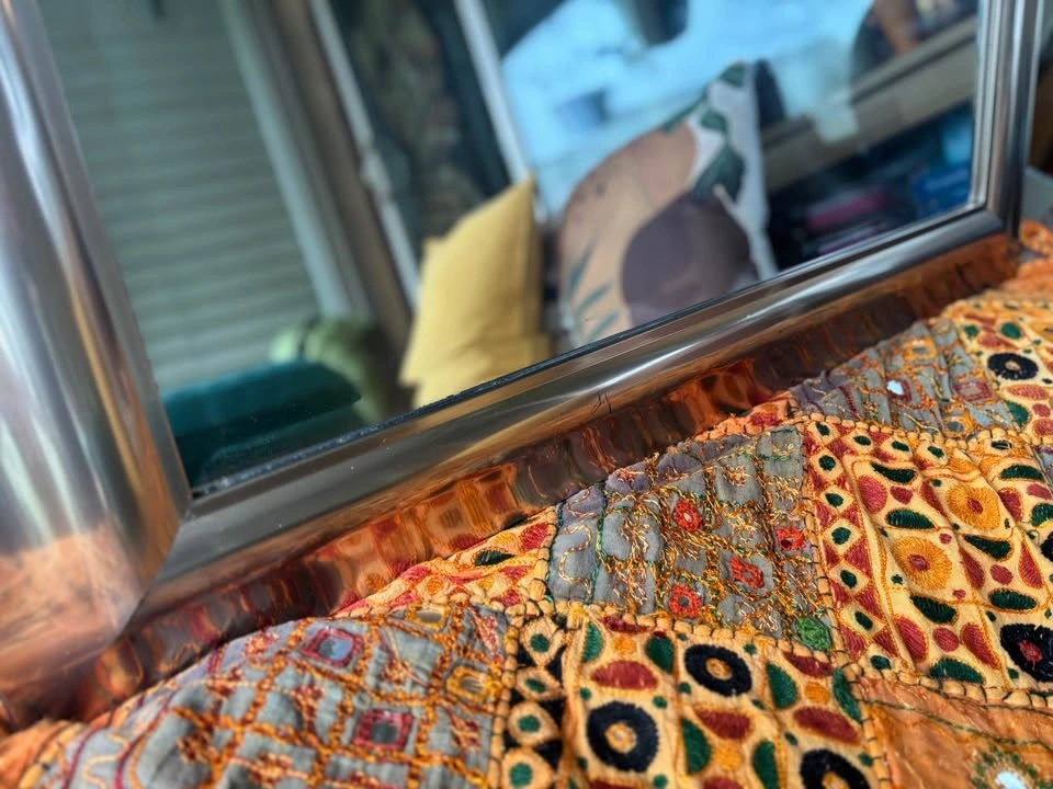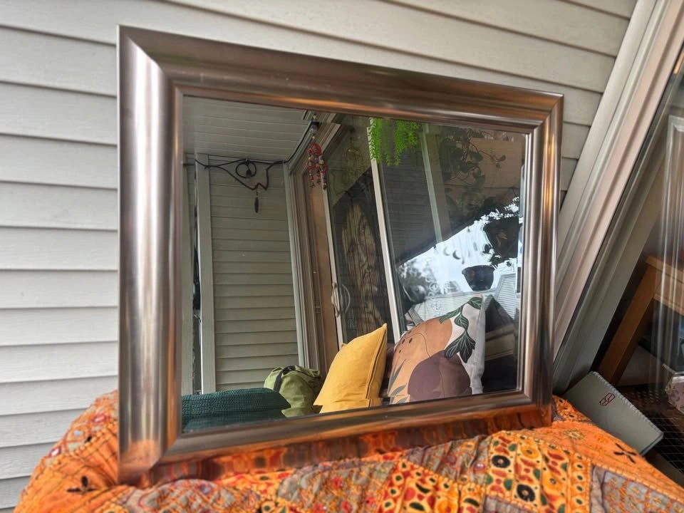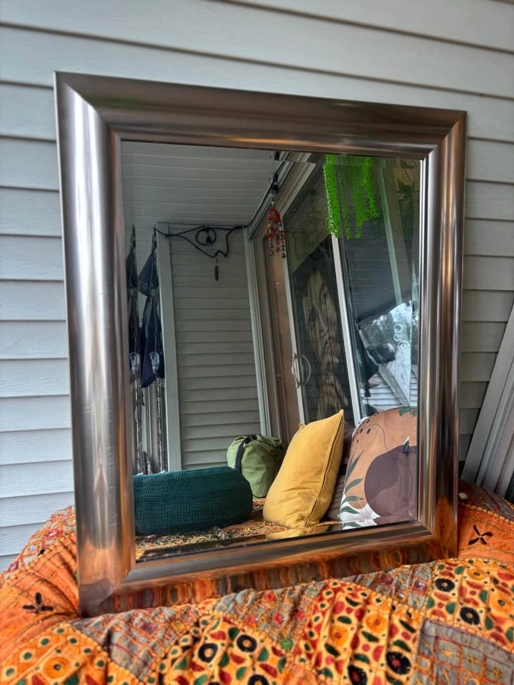 A striking vintage wall mirror featuring a sculptural brushed metal frame with softly rounded edges and a warm, reflective finish. Clean, architectural, and quietly glamorous — this piece brings depth and light without overpowering a space. Approx. 34.5x28.5in. The mirror is Made in Canada, with solid construction and D-ring hardware for secure hanging. The frame has a beautiful satin-metal sheen that catches ambient light subtly, making it ideal for bedrooms, entryways, living rooms, or layered gallery walls. Measurements are shown clearly in the photos for accuracy. There are a few light scuffs consistent with age and gentle use, but nothing distracting — they blend into the brushed finish and are not noticeable once hung. A timeless piece that works effortlessly across styles: modern, mid-century inspired, boho, eclectic, or minimalist interiors. ✨ Vintage charm with real presence ✨ Substantial feel, not flimsy ✨ Clean lines, sculptural profile ✨ Ready to hang. Pick up by Kensington square in North Burnaby or by Parkgate in North Vancouver.