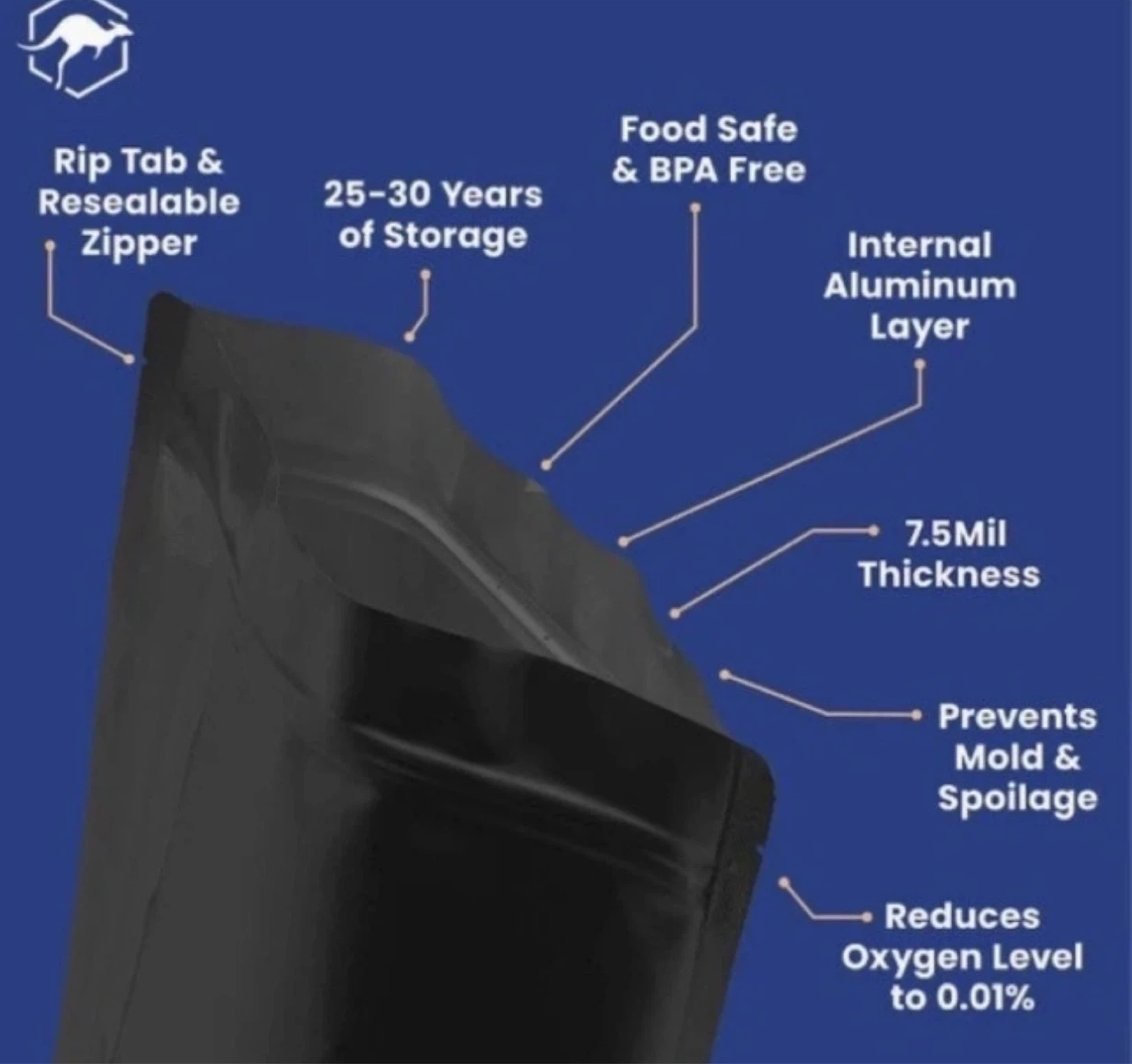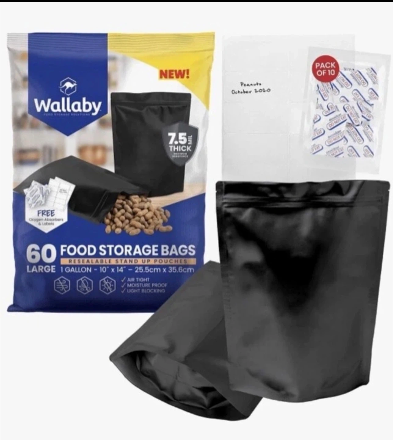 These are 60 Wallaby resealable stand-up food storage bags. They're 7.5 mil thick with an internal aluminum layer. Airtight and moisture-proof, they prevent mold and spoilage. Great for long-term food storage!