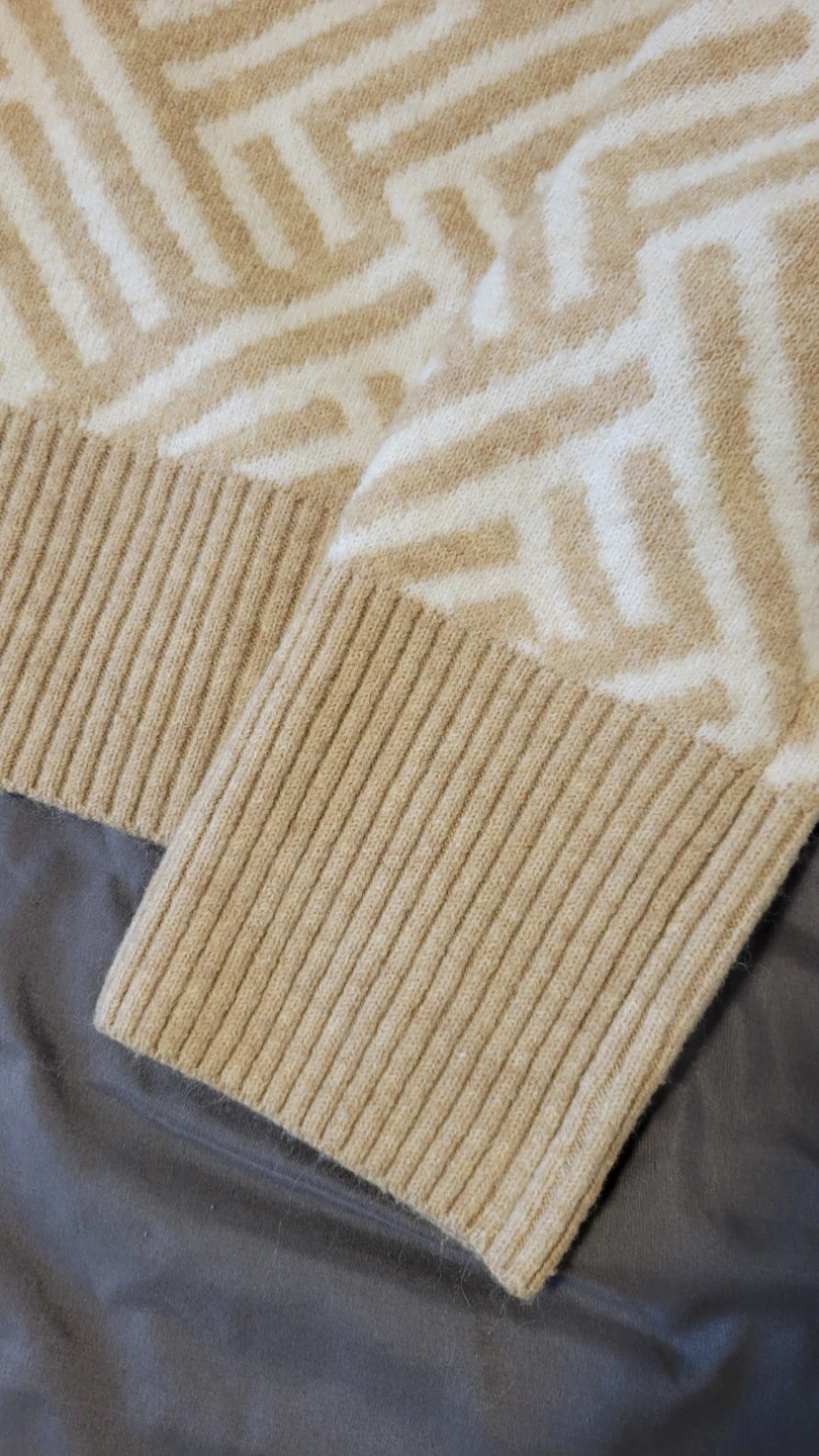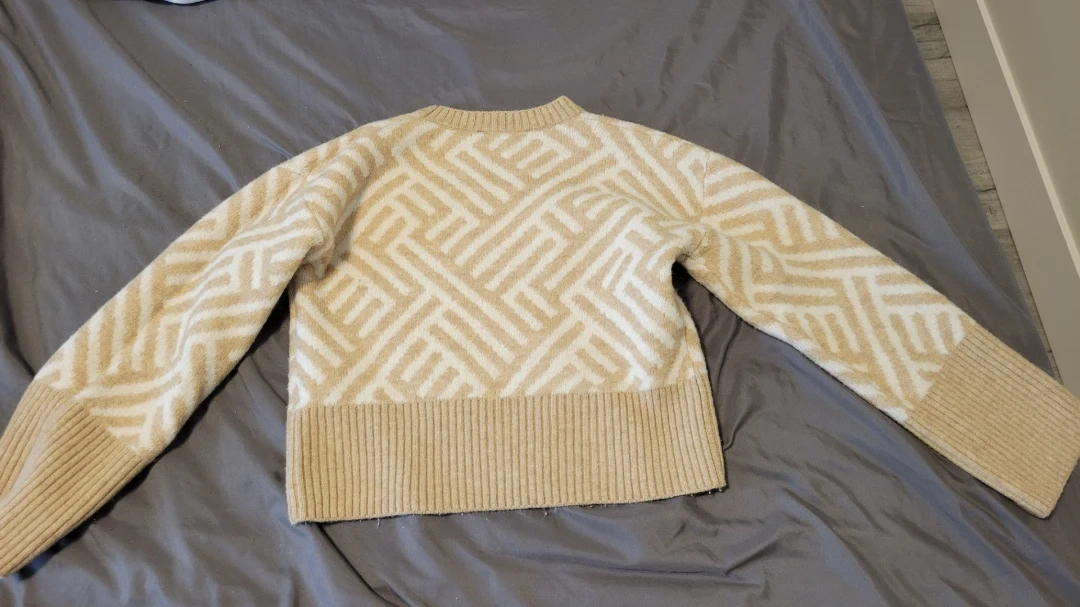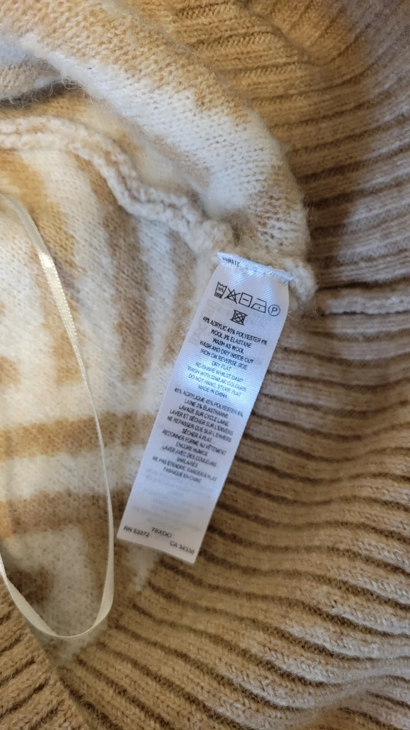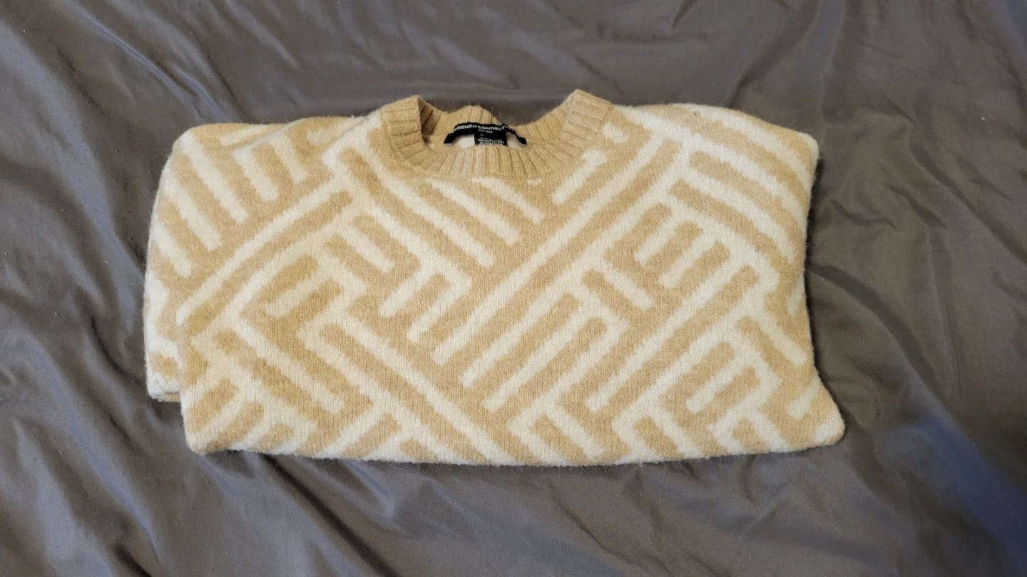 Cozy French Connection sweater with a cream and tan geometric pattern. Made from 48% acrylic, 47% polyester, and 5% elastane. Machine wash cold, inside out.