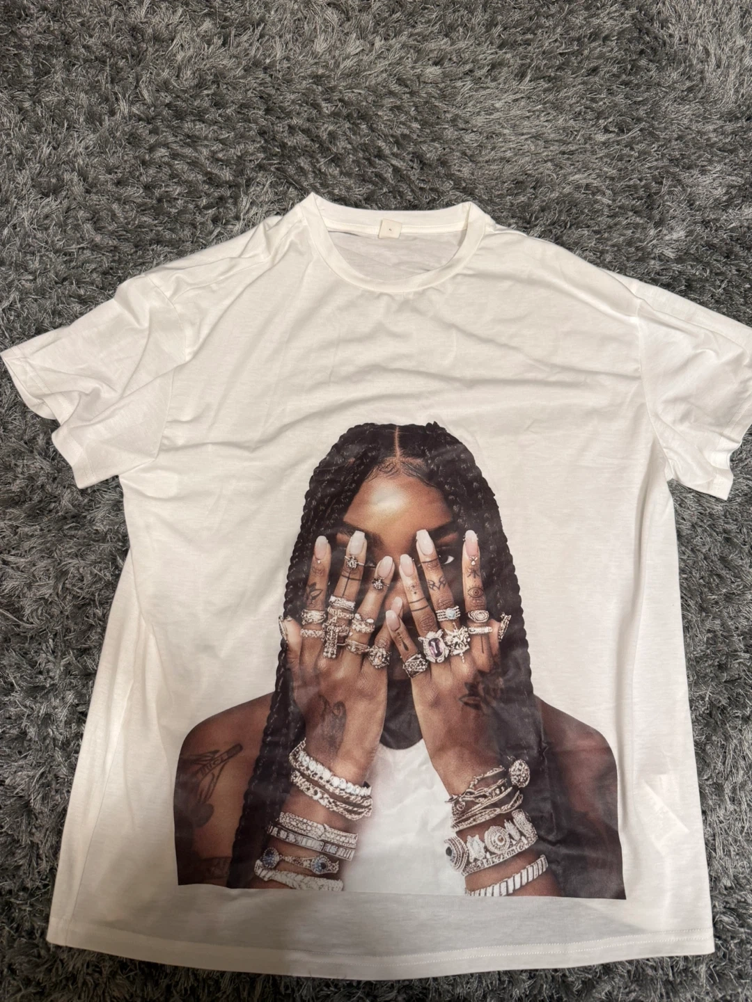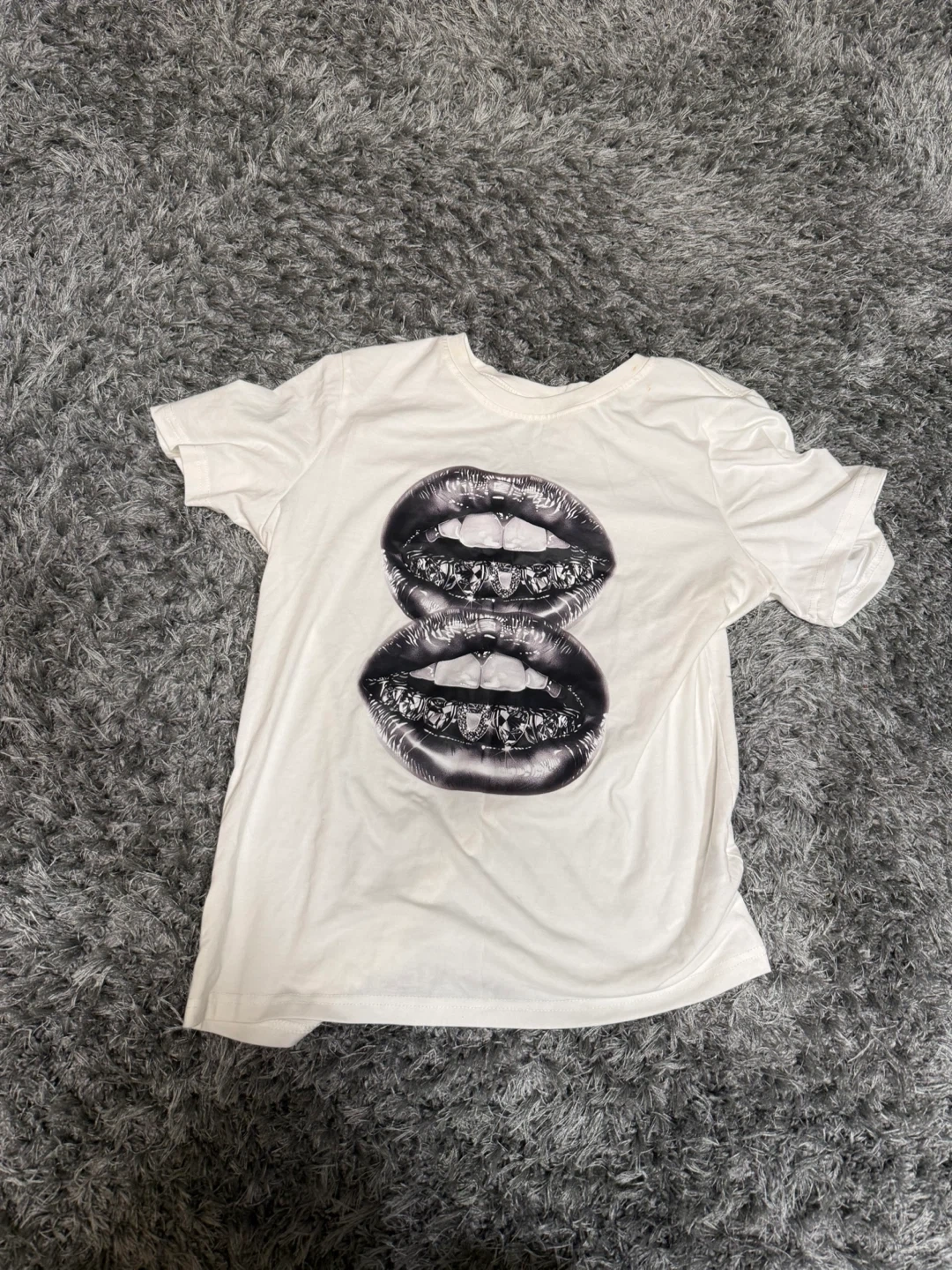 This white t-shirt features a bold graphic of two sets of lips, one stacked on top of the other. The lips have a shiny, metallic appearance with diamond-like accents on the teeth. It's made from a soft cotton blend material. A great statement piece for any casual outfit! All of them only use once each one is 5$ can sale it for3$