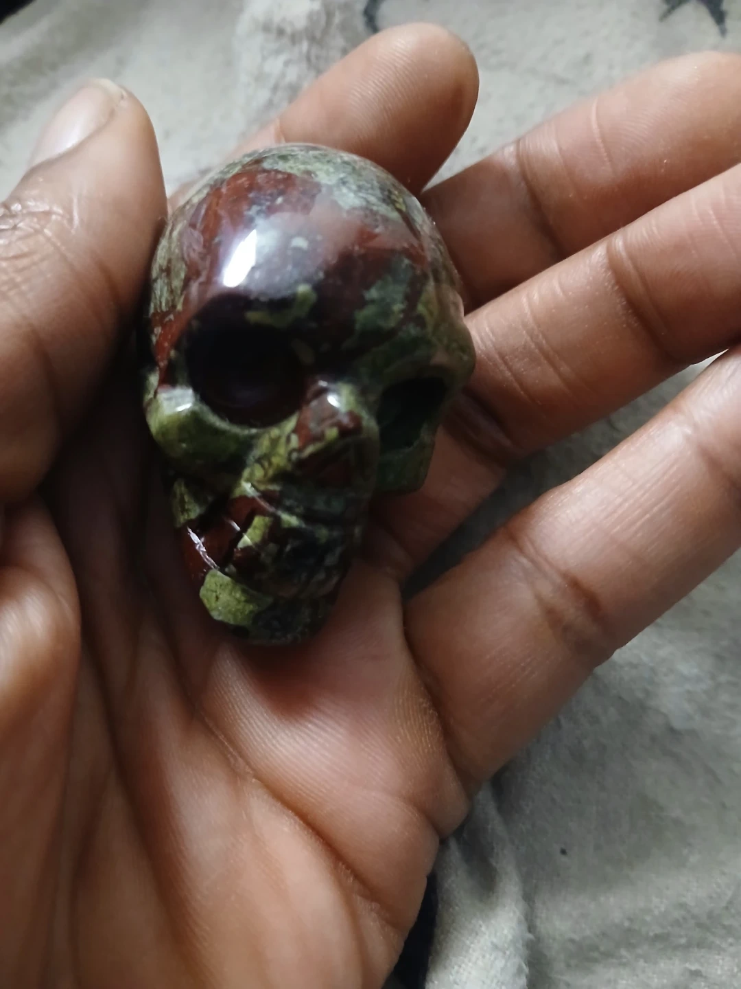 This is a small, hand-carved skull made from Dragon Bloodstone. It features intricate details and a unique pattern of green and red hues. It's a great piece for collectors or as a decorative item.