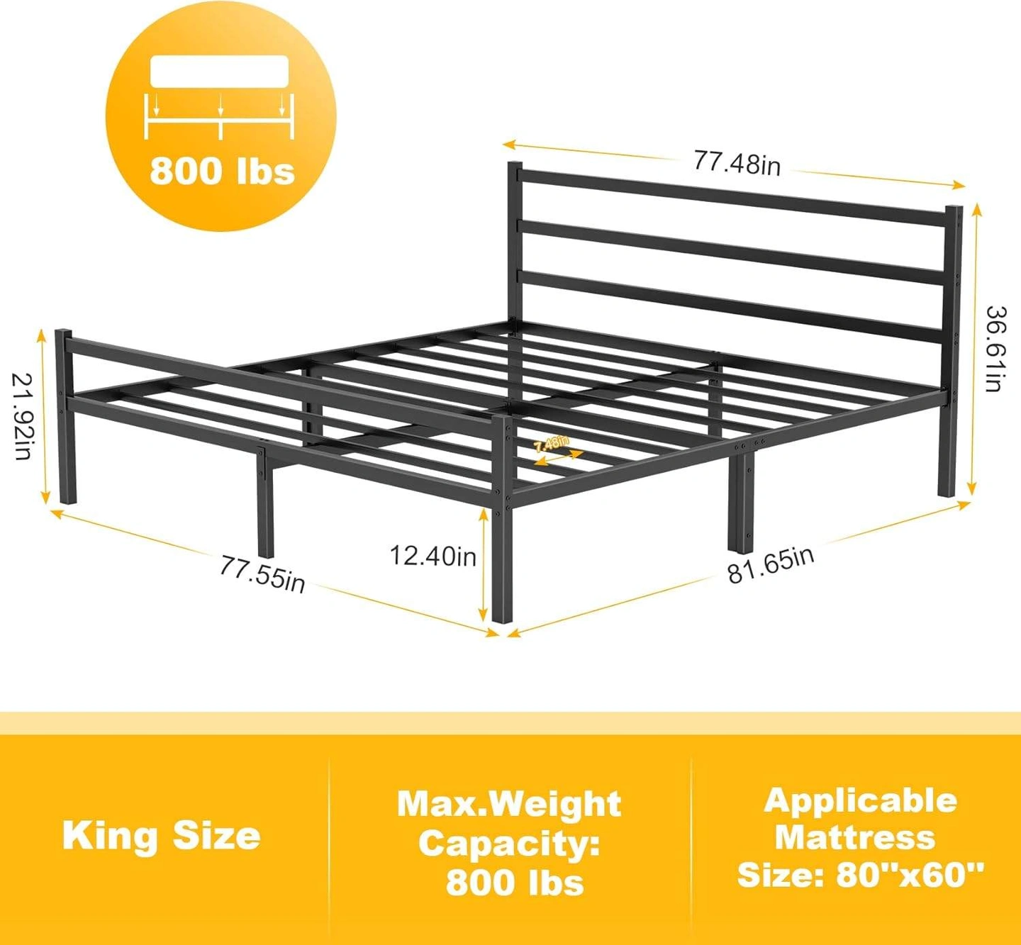 【12.4" Storage Underneath】81.5" x 77.5"x 12.4". Mr IRONSTONE king size bed frame offers 12.4 inches of clearance,