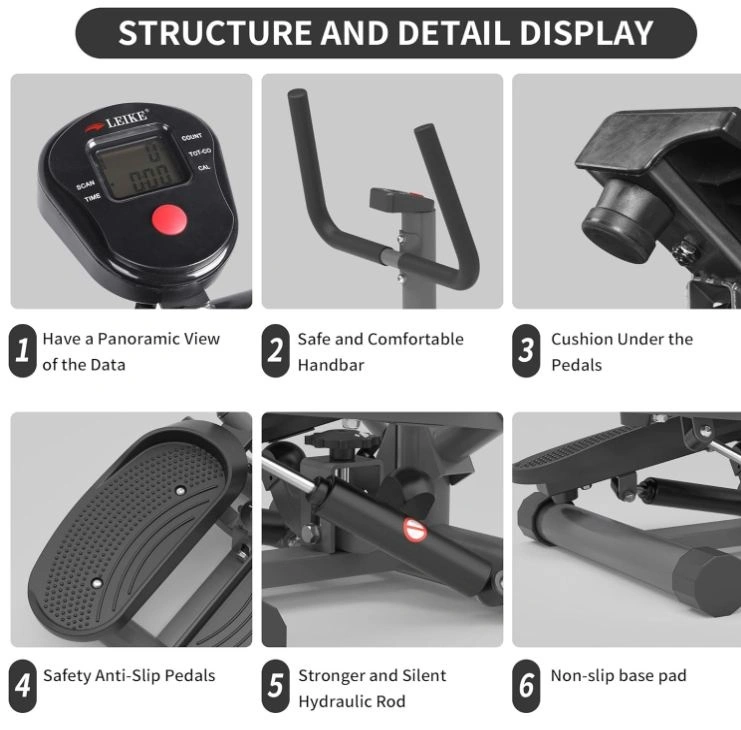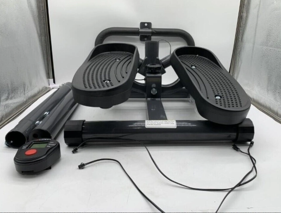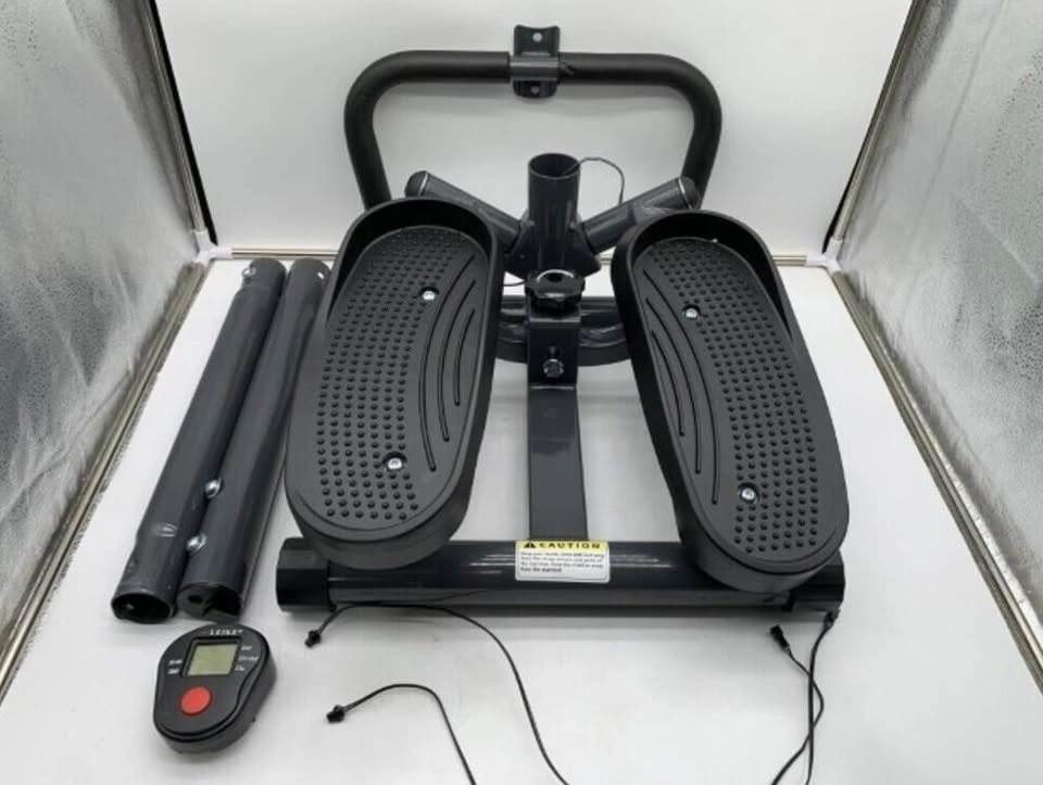 Portable twist stair stepper with adjustable resistance, hand bar, and LCD monitor. Black.