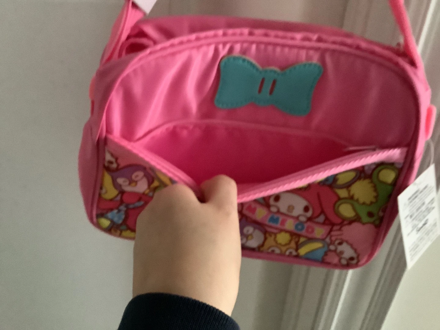 This pink crossbody bag features a colourful My Melody graphic print. It has a top zipper closure and an adjustable shoulder strap. Perfect for kids to carry their essentials! Has 2 pockets and includes a free sticker!