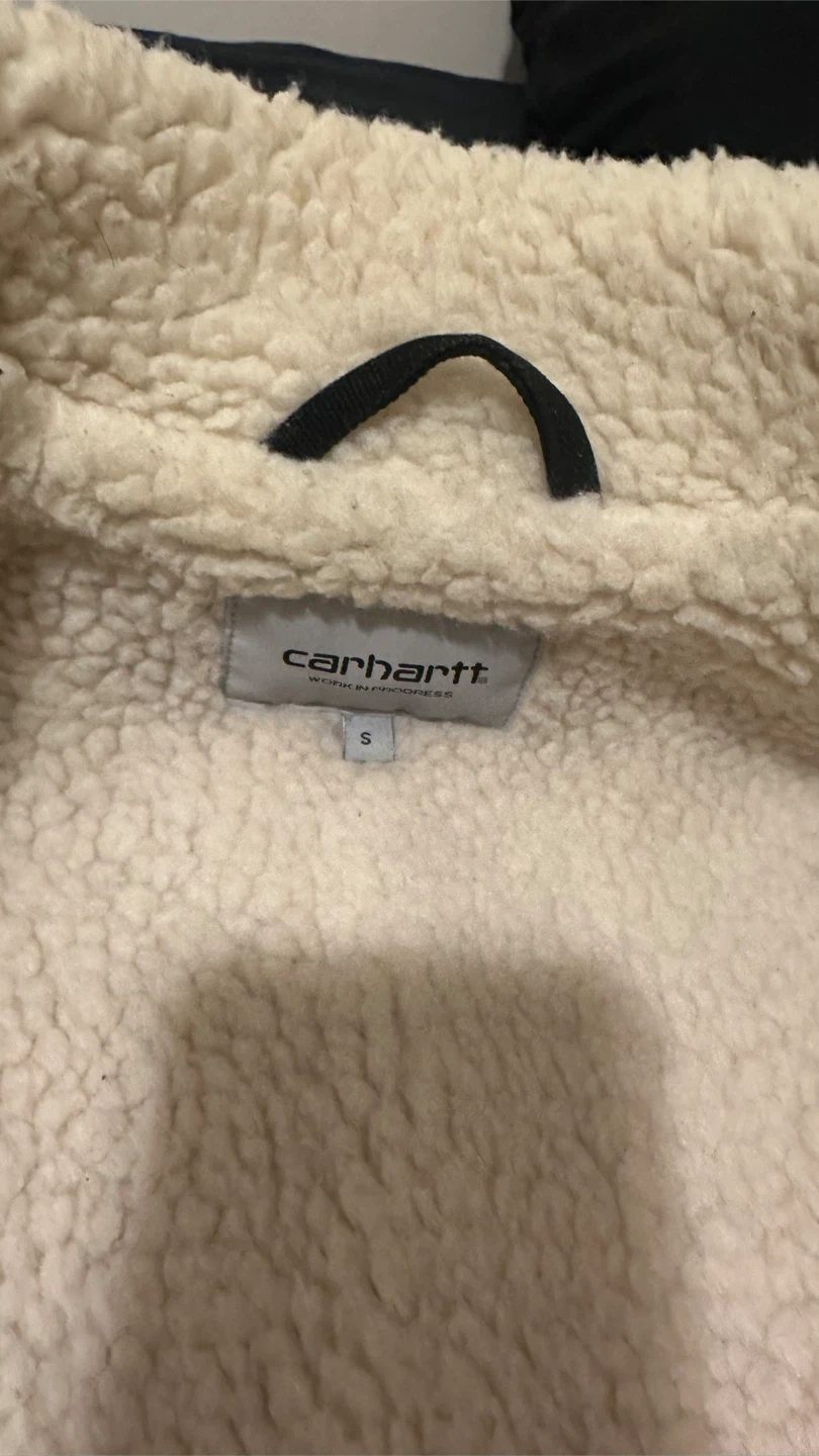 I'm selling a Carhartt Work In Progress jacket in black. It's a size small and features a cozy, sherpa-lined collar. Perfect for cooler weather!