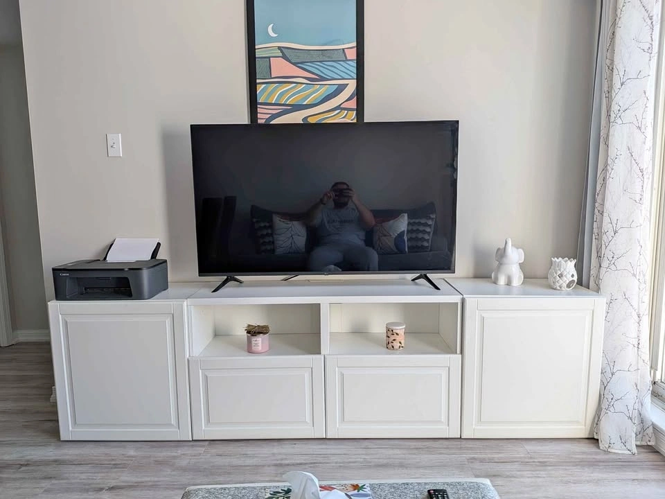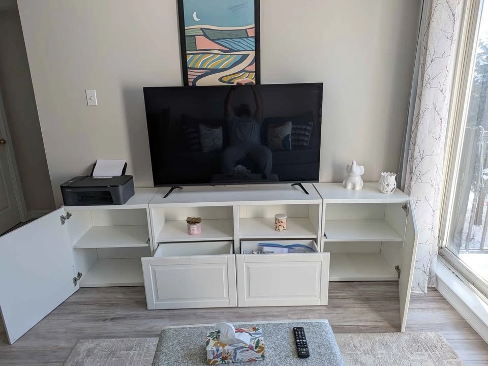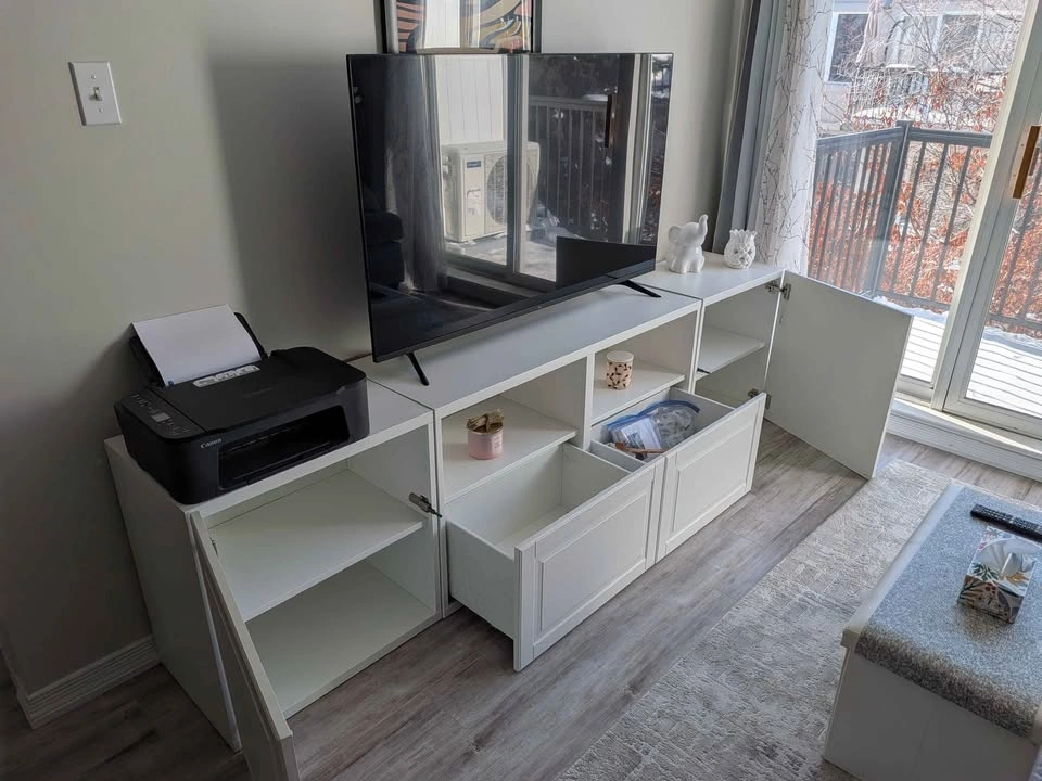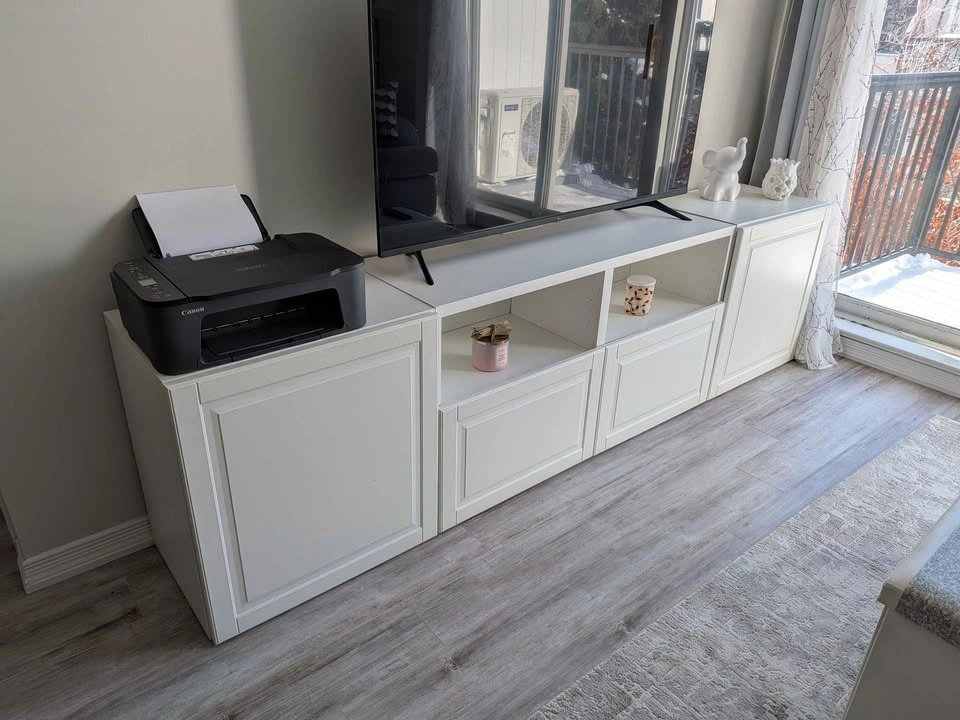Clean white media console with lots of storage. Features doors on the ends and two drawers in the middle, plus open shelves for devices or decor. Super versatile for any living room or bedroom setup. It's in 3 sections: the middle console with shelving and drawers, and two end cupboards.
