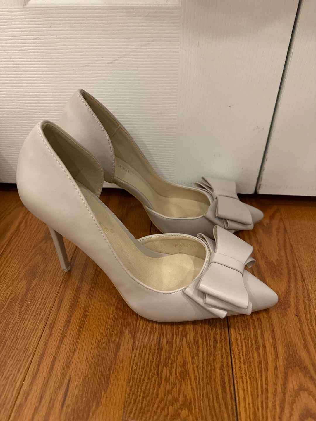 Cute light beige pointed-toe heels with a decorative bow accent. These pumps have a stiletto heel and a side cut-out design. Perfect for dressing up an outfit!