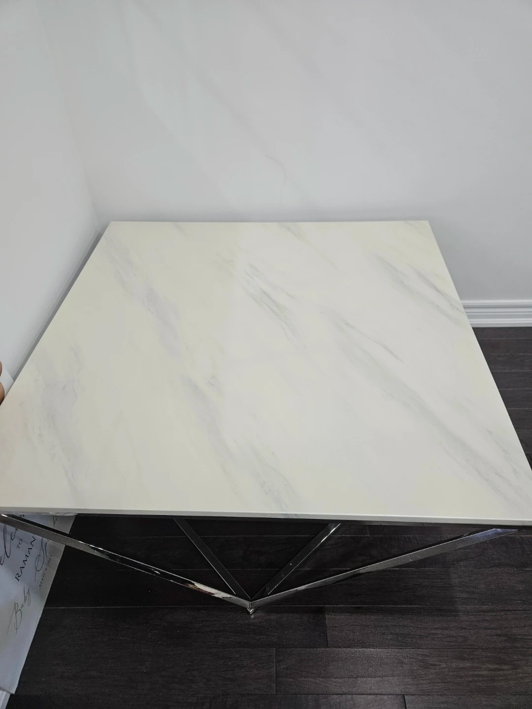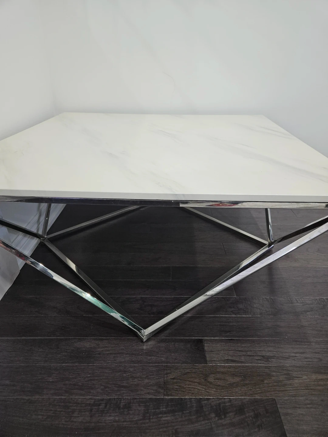 A stylish coffee table featuring a white marble-patterned top and a sleek chrome geometric base. It's a great centrepiece for any living room. The durable construction ensures it's built to last. This table works well in contemporary spaces.