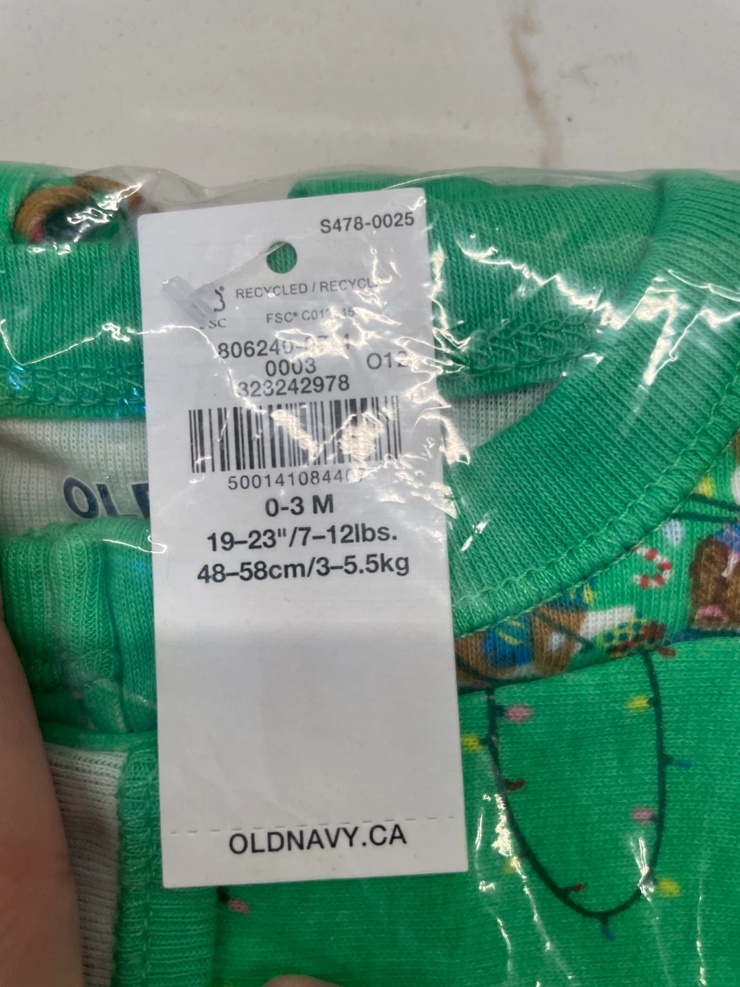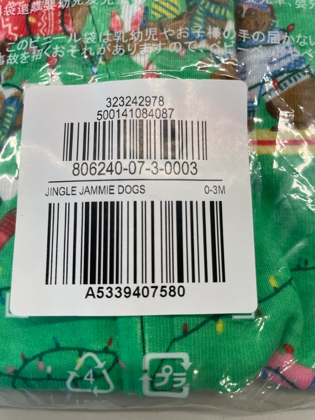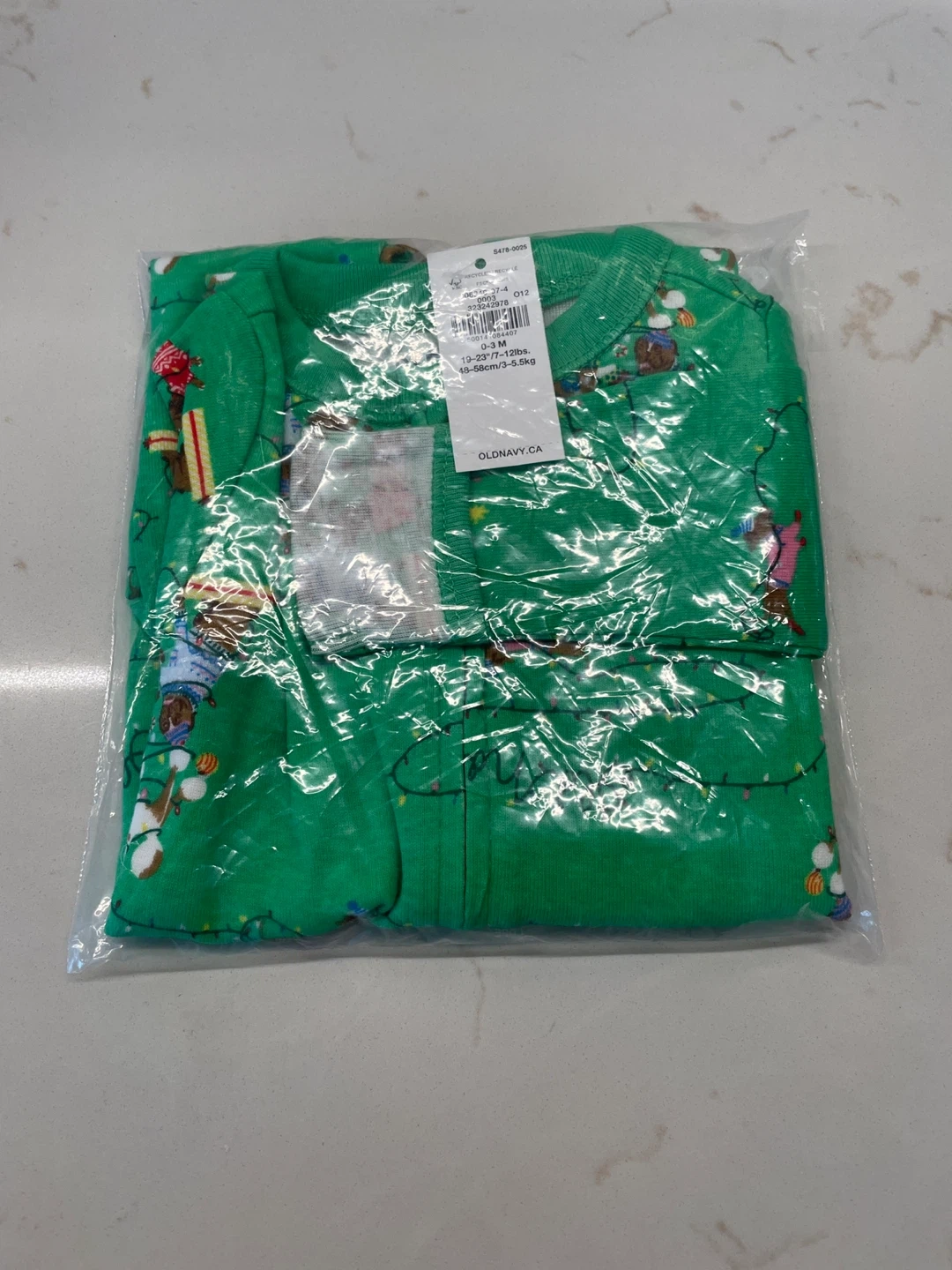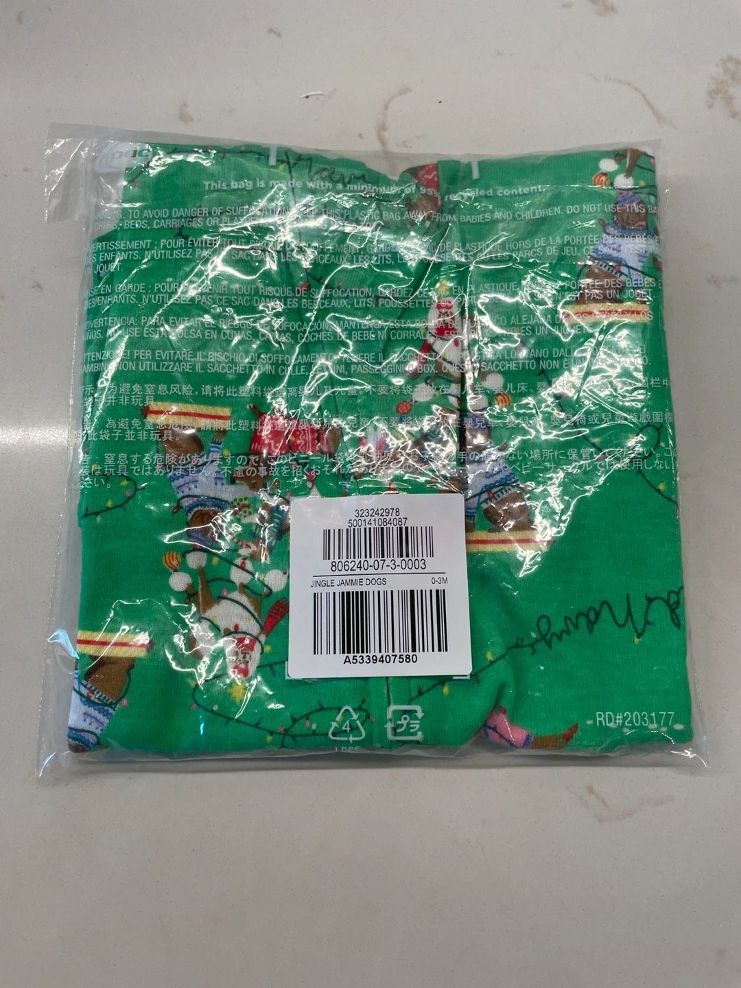 Green Old Navy baby pajamas with a "Jingle Jammie Dogs" print. It's size 0-3M, fitting 19-23 inches and 7-12 lbs (48-58 cm/3-5.5 kg). Made from soft fabric for comfort. Great for the holiday season!