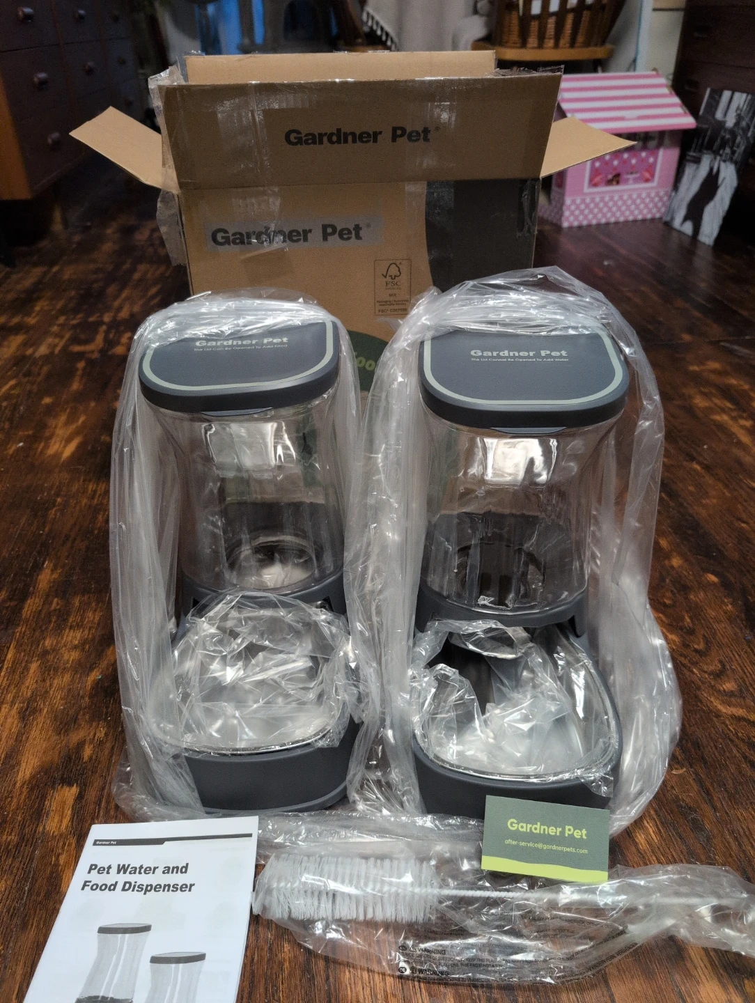Brand new in box, Gardner Pet Water & Food Dispenser in dark grey. Both containers are 3.85 L capacity dispensers. These dispensers keeps your pet's food and water fresh. 2 pcs listed on amazon for 60.00. Similar listing on the site charging 28 and up just for water dispenser.