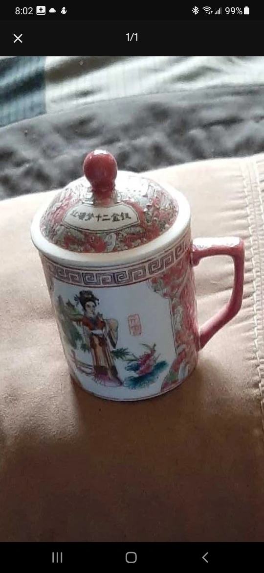 Selling a vintage Chinese tea mug with a lid. It has a unique design with traditional Chinese art. The mug appears to be in good condition and would be a lovely addition to any collection!