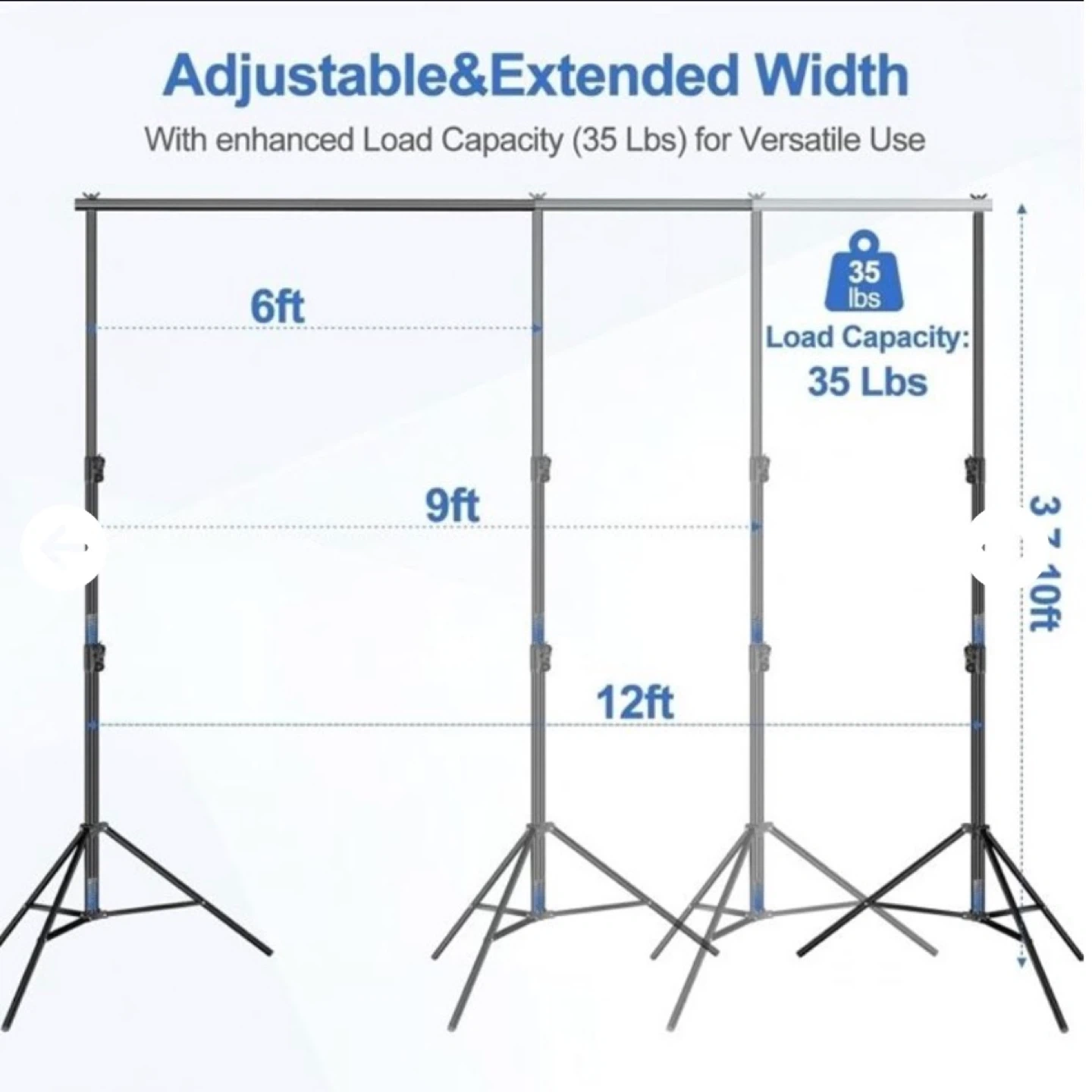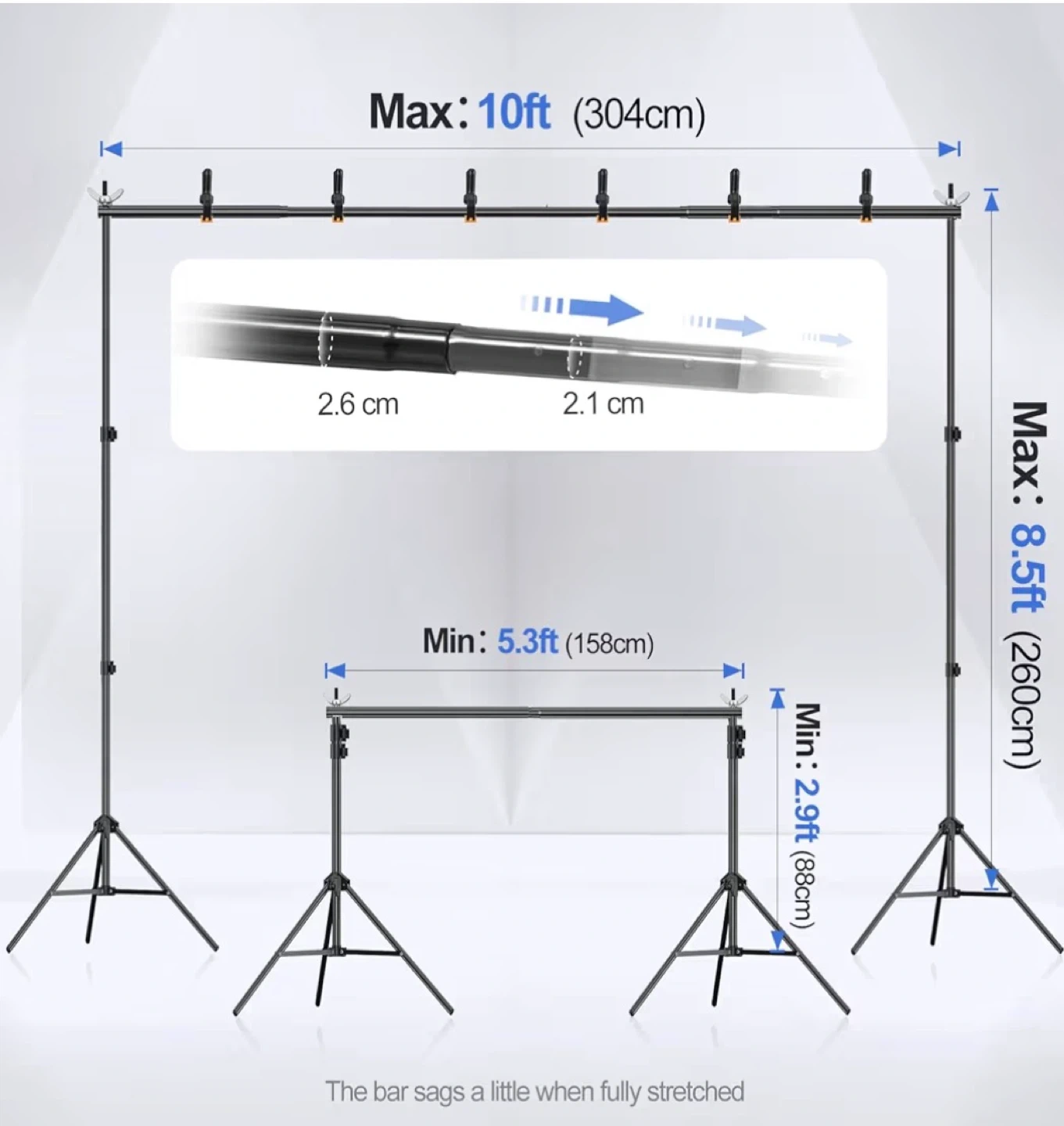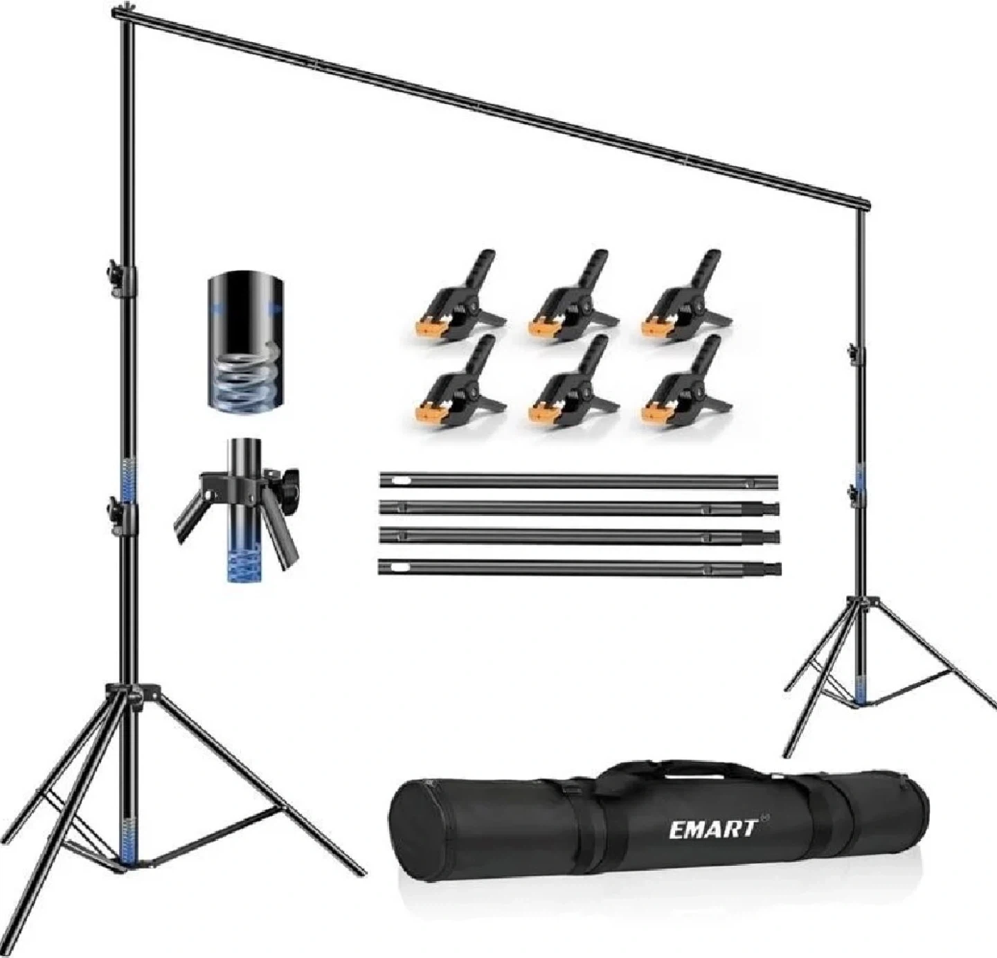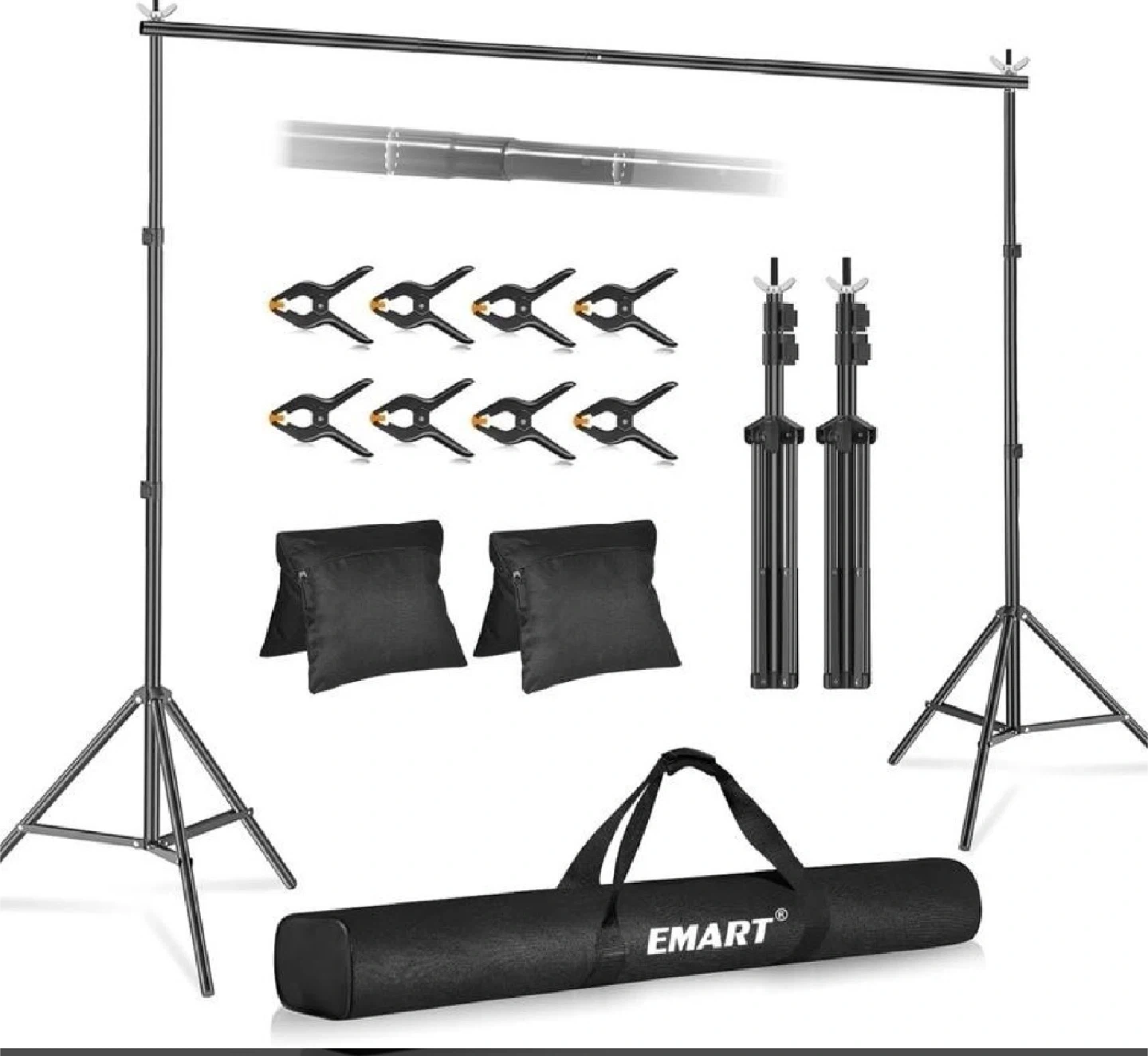 This EMART backdrop stand kit includes two tripod stands and one crossbar. It's adjustable in height from 2.9ft to 8.5ft and width from 5.3ft to 10ft. The kit comes with 8 clamps, 2 sandbags, and a carry bag for easy transport. It's perfect for photo studios, events, or home use!