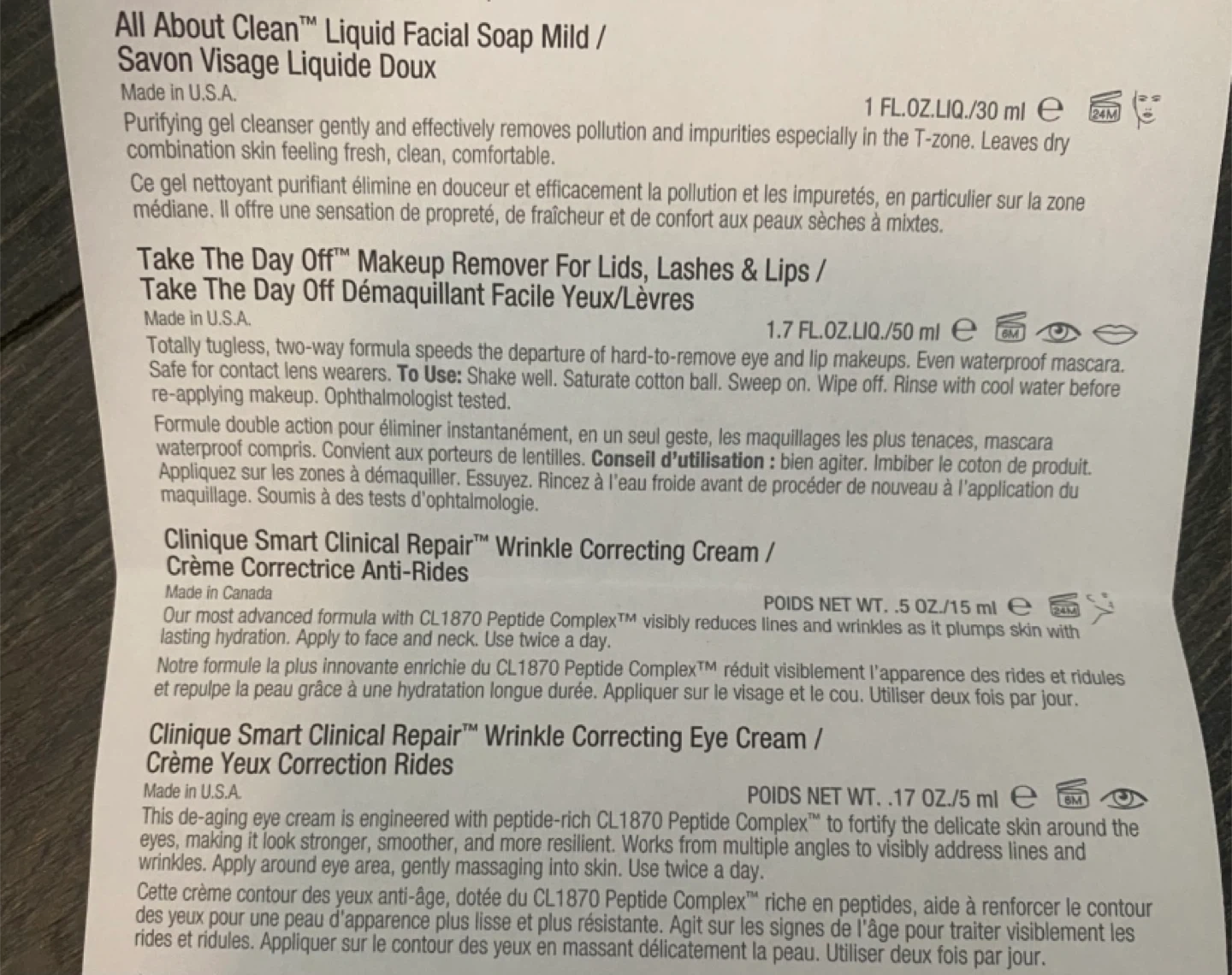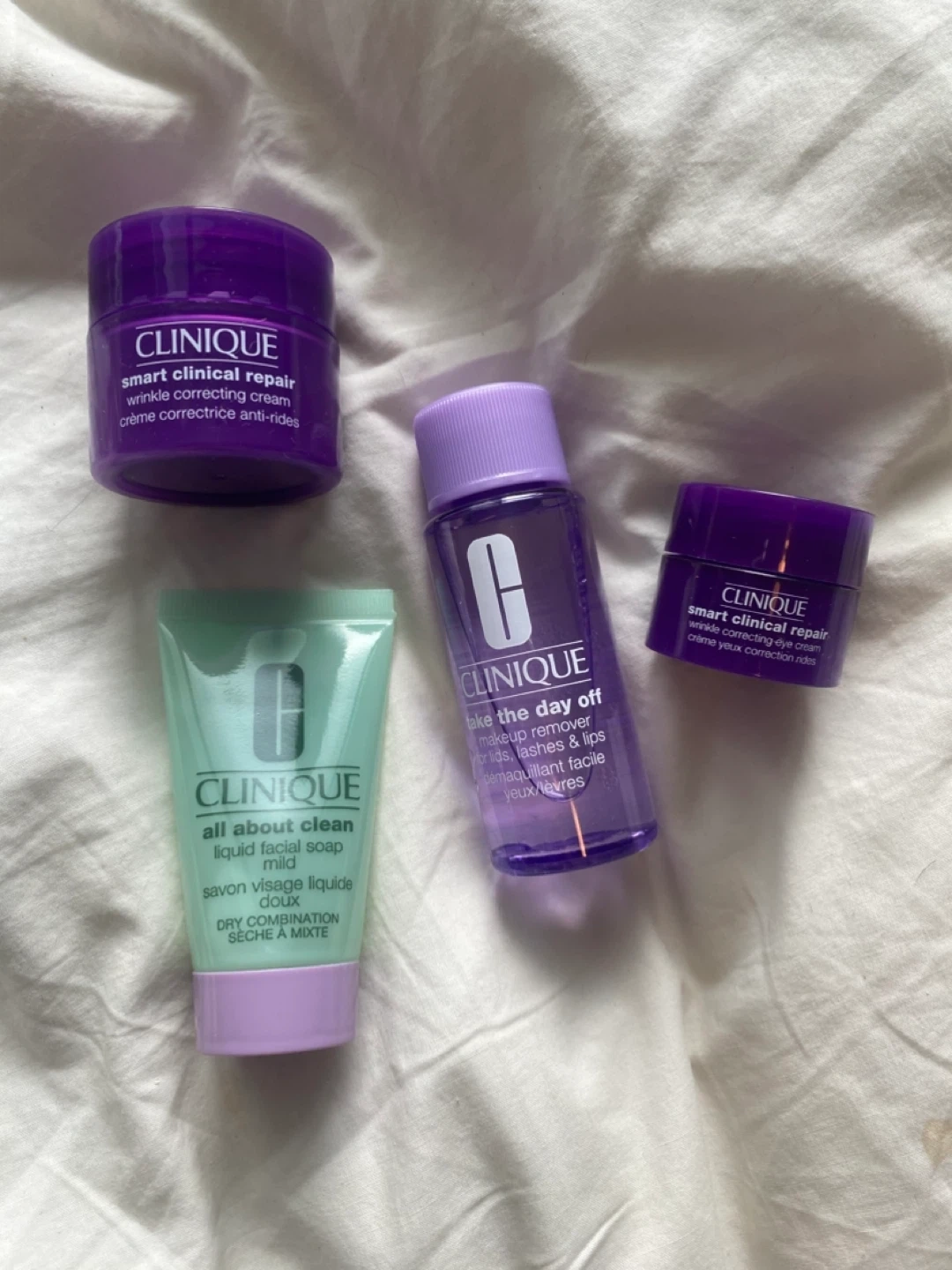 This unused Clinique minis set collection includes Take The Day Off makeup remover, All About Clean liquid facial soap, two jars (15ml and 0.5ml) of Smart Clinical Repair wrinkle correcting cream, and cosmetic bag. Useful for travel or trying out popular Clinique products!