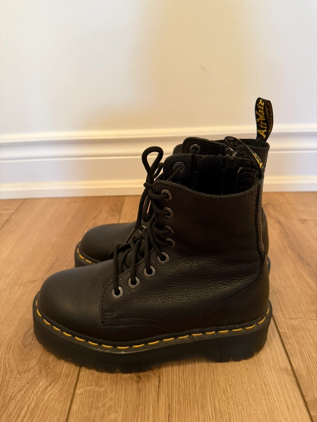 Selling a pair of Dr. Martens platform boots in black, size 7. They feature a lace-up design with a side zipper for easy wear. The boots have the classic yellow stitching and 'with bouncing soles' heel loop. Great for adding a bit of edge to any outfit! Barely worn since they were too big.