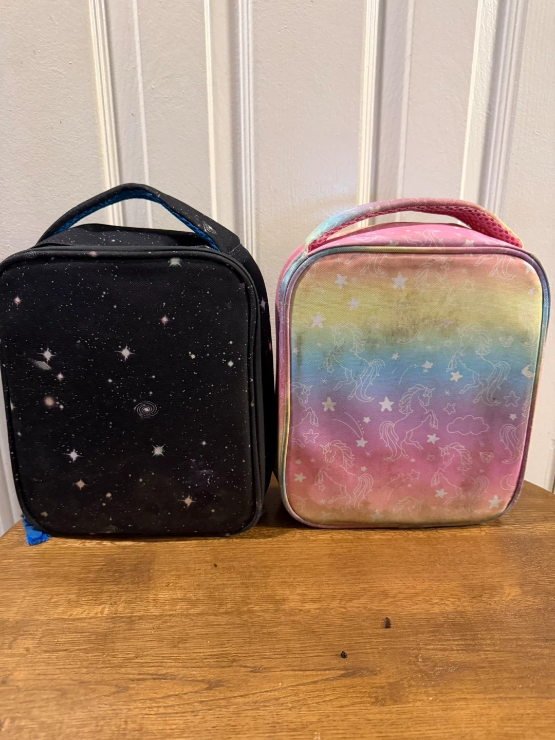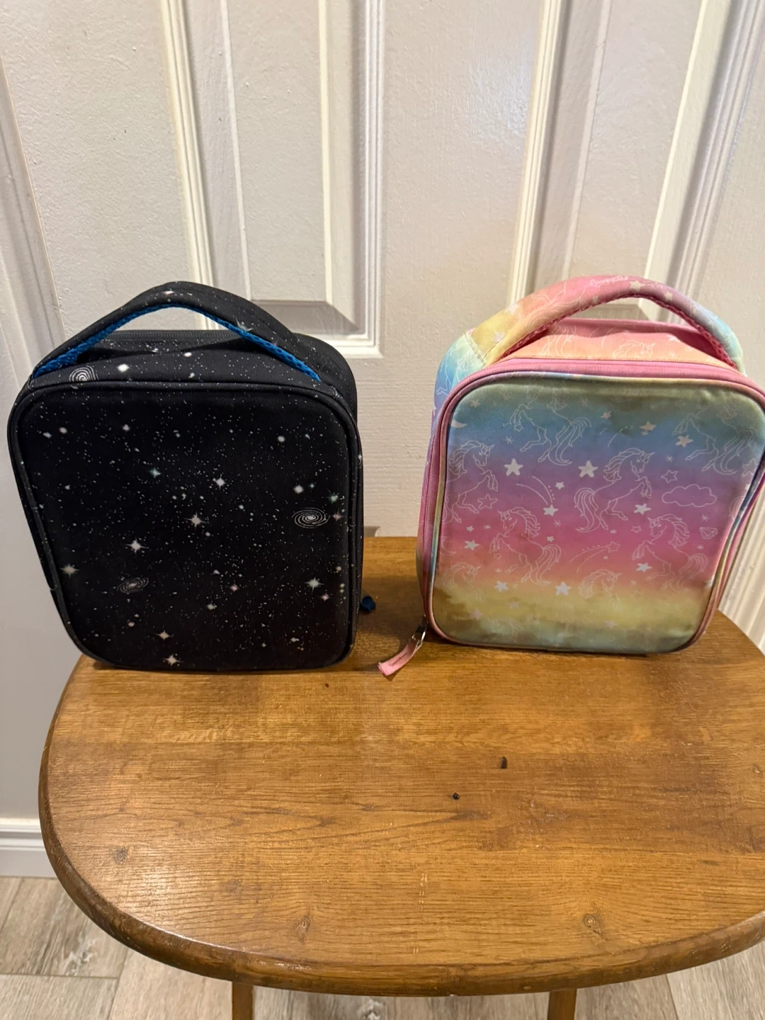 Two insulated lunch bags, one with a galaxy print and the other with unicorns and rainbows. Includes a grey Thermos food jar and a blue utensil set with a bear design. Great for packing warm or cold lunches!