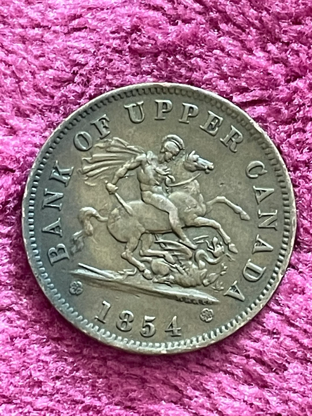 This is a Bank of Upper Canada token. It's dated 1854 and says 'One Penny' on the other side. The token features maritime imagery.