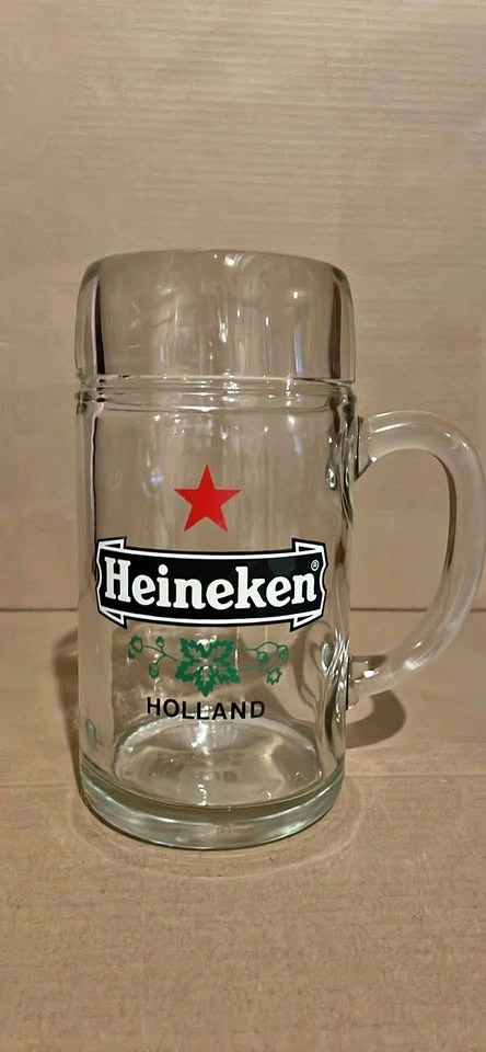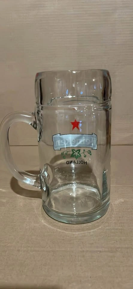 Classic Heineken glass beer mug with the iconic logo, red star, green hops design, and 'HOLLAND' text. Great for enjoying your favorite brew.