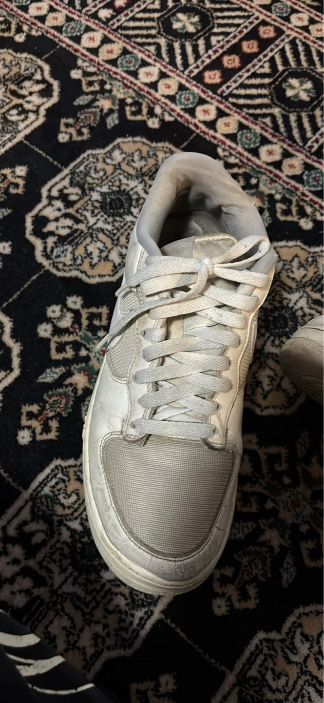 White leather Nike Air Force 1 sneakers. These shoes feature a classic design with the iconic Nike swoosh and "AIR" branding on the midsole. They're made of leather with textile accents. A comfortable choice for everyday wear!