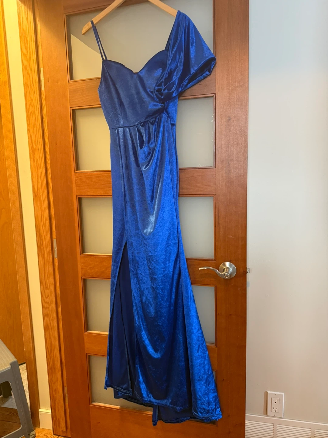 This stunning royal blue maxi dress features a chic one-shoulder design and a flattering ruched waist. It has a sophisticated high leg slit for added flair. It's perfect for formal events and parties!