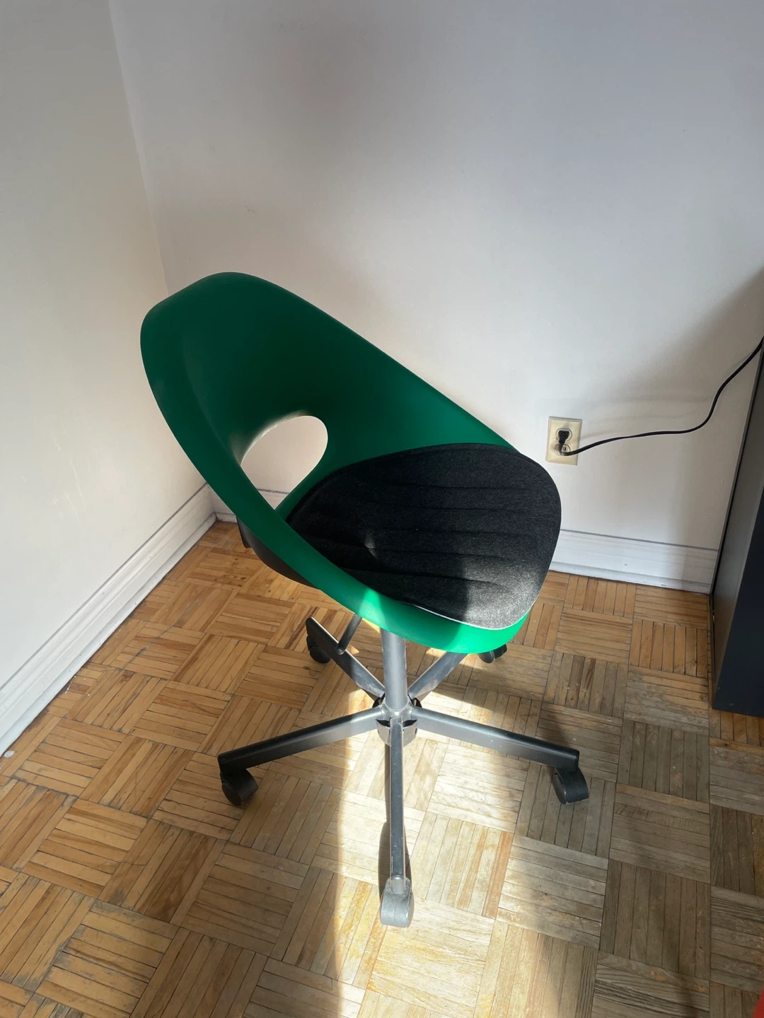 IKEA Chair: Green plastic shell, grey fabric seat. Five-star base with casters and adjustable height. Comes with IKEA’s seat pad as show in the picture.