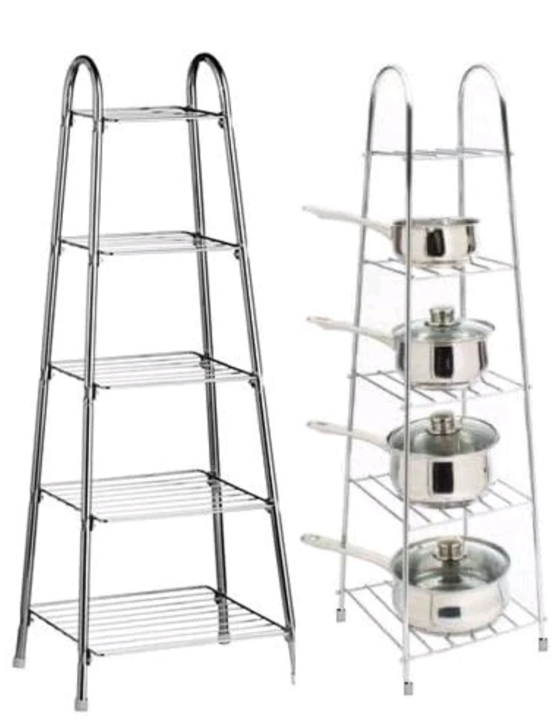 This product is a 5 Tier Kitchen Pan Stand and Storage Organizer designed to organize pots and pans in a compact, vertical space.