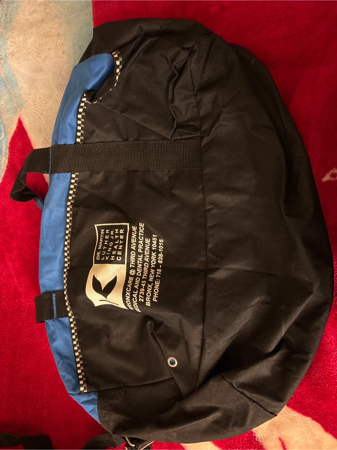 This is a travel bag from BronxCare Medical and Dental Practice. It has a black and blue design with dual handles. The bag features the practice's address and phone number printed on it.