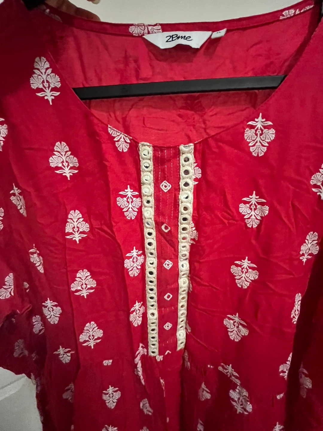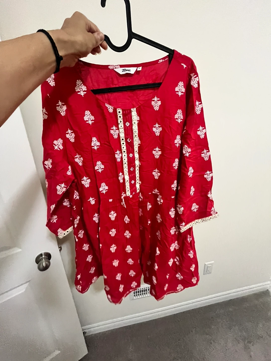 This is a cute 2Bme tunic top! It's red with a white floral pattern. Perfect for adding a pop of colour to your wardrobe