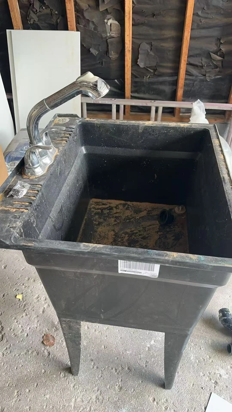 This is a black utility sink with an attached faucet. It's a sturdy sink made of durable plastic. Great for laundry rooms or garages! 24x24 inch