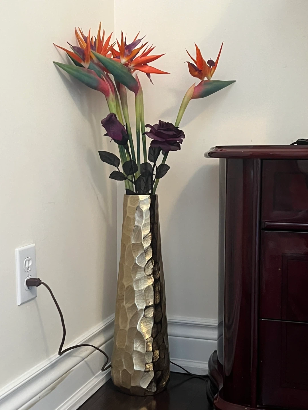 This tall, textured floor vase features a striking hammered metallic finish in gold and dark brown. It's filled with artificial Bird of Paradise flowers and dark roses, adding a vibrant touch to any room. A lovely decorative piece for your home!
