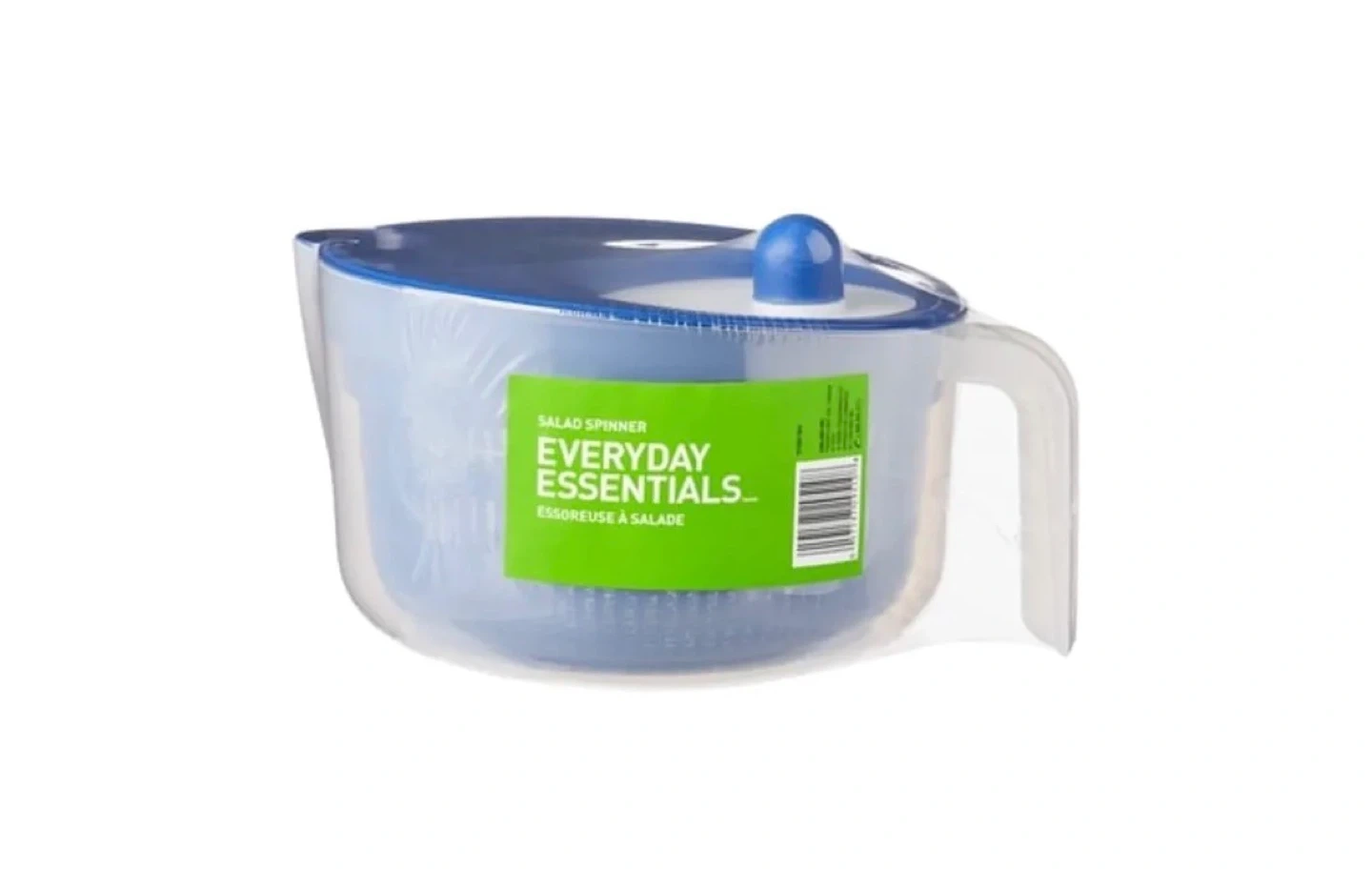This salad spinner is from the Everyday Essentials line. It features a blue lid and a clear body with a white handle. A salad spinner makes drying greens quick and easy!