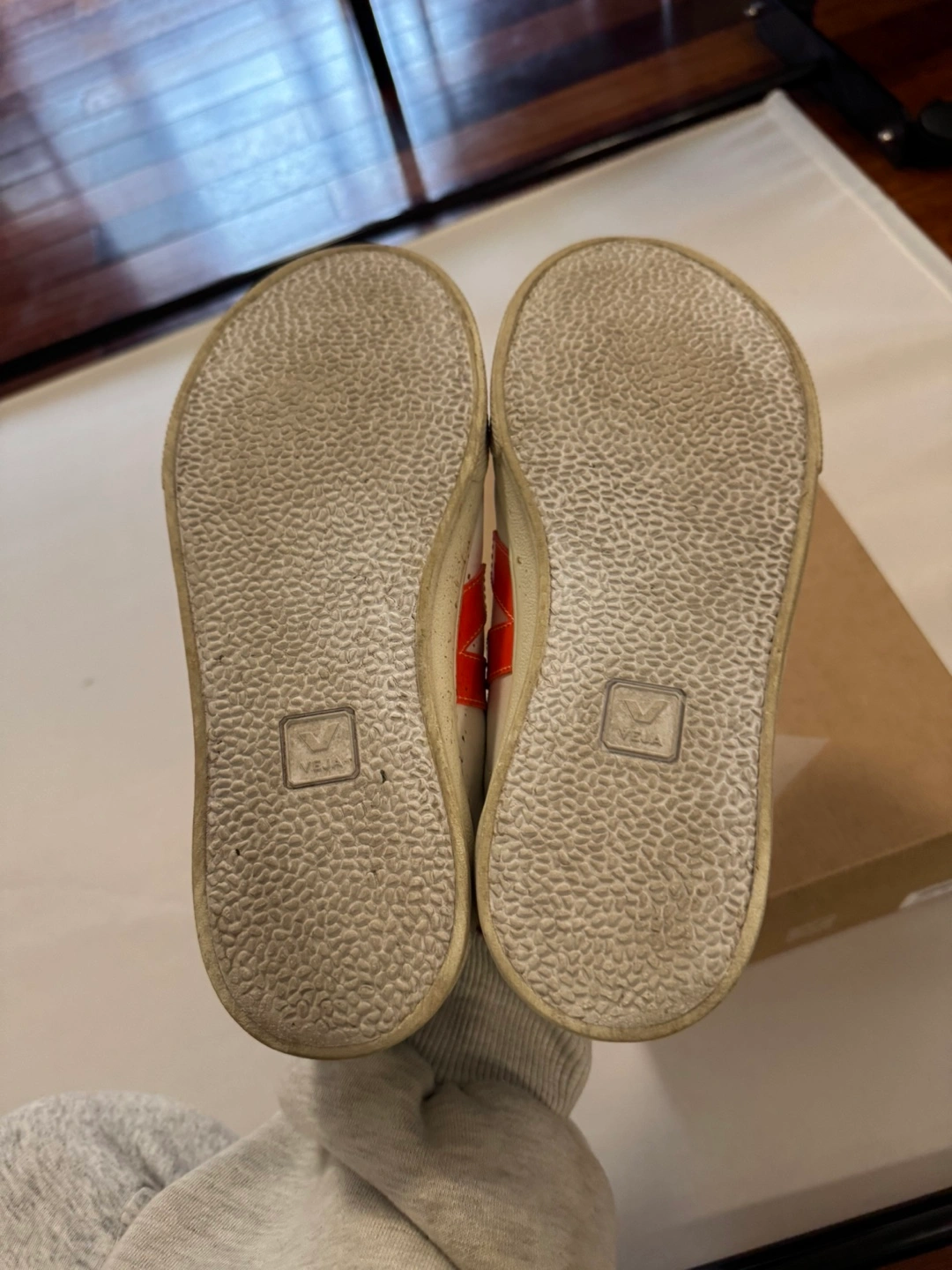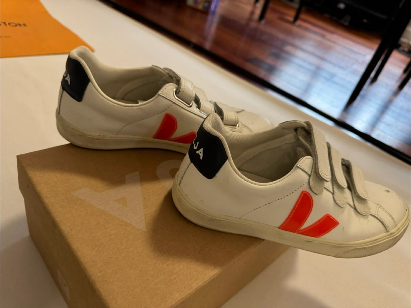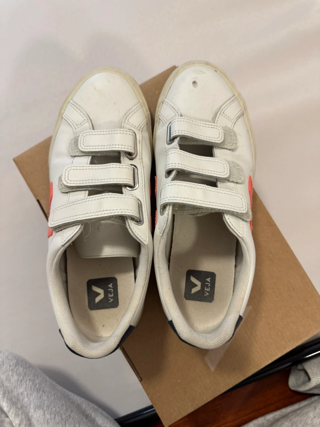 Selling a pair of Veja velcro sneakers! They are white with a red logo and a navy blue heel. They are in used condition, as seen in the photos, but still have lots of life left. Size US 7
