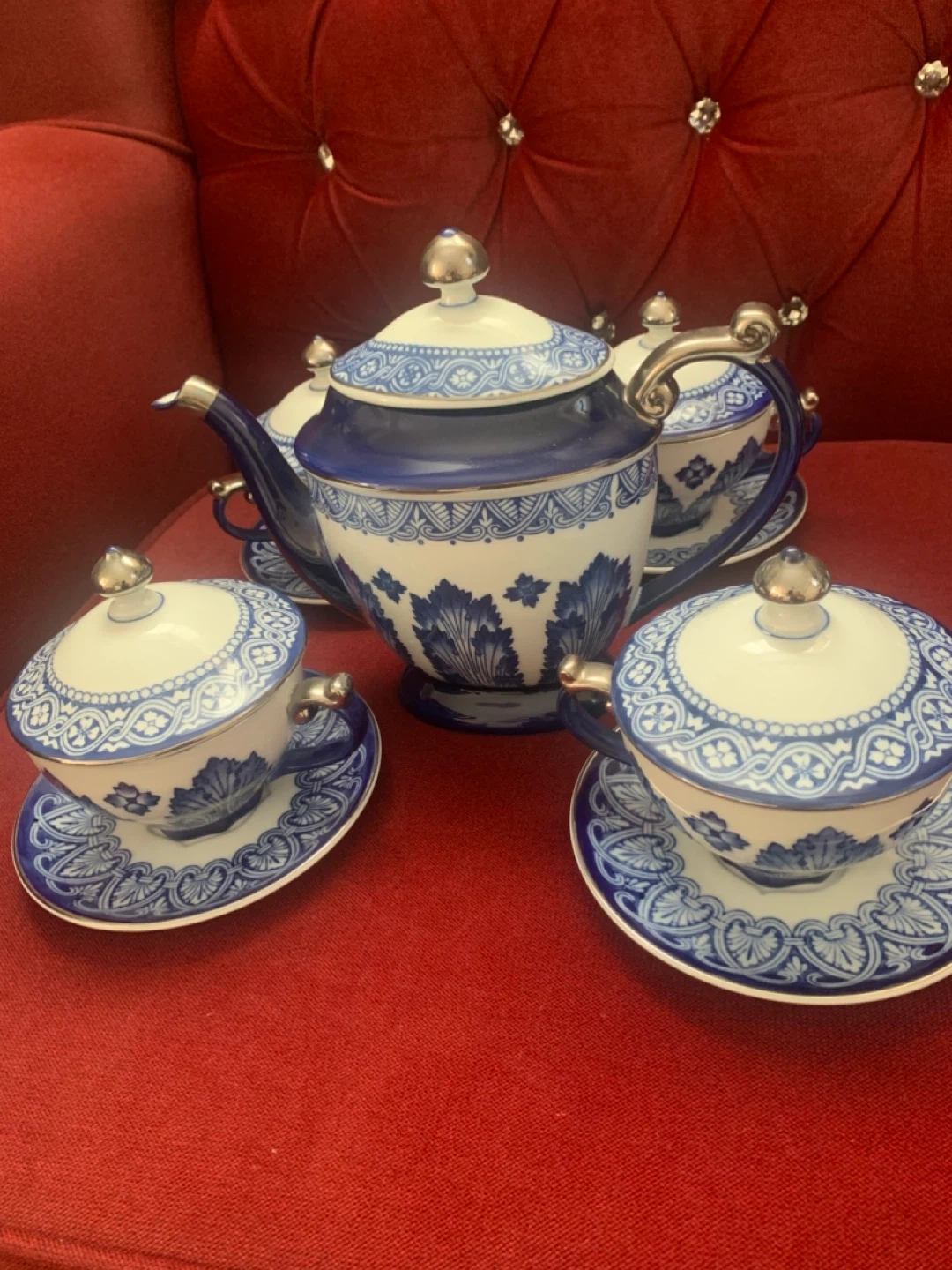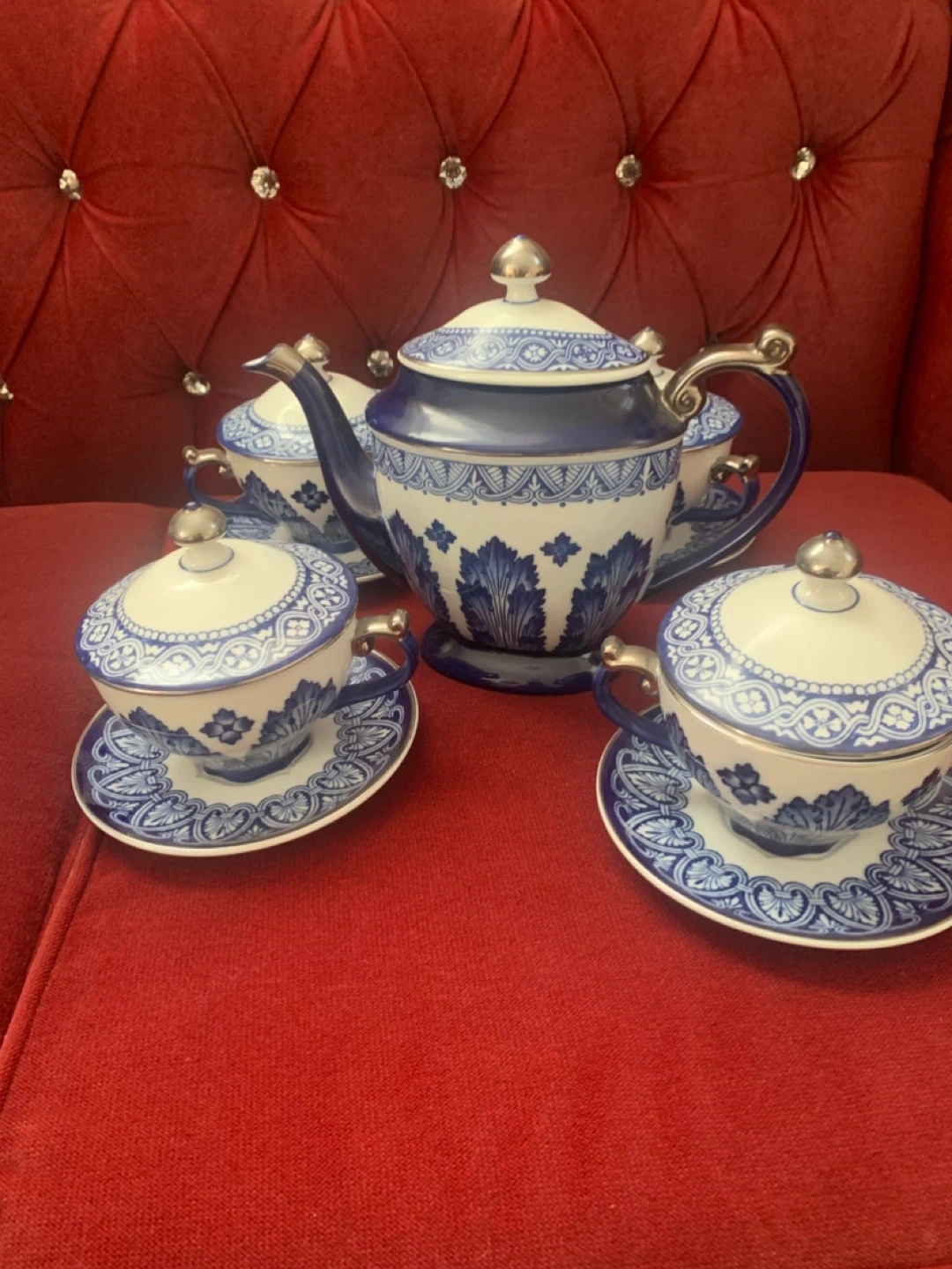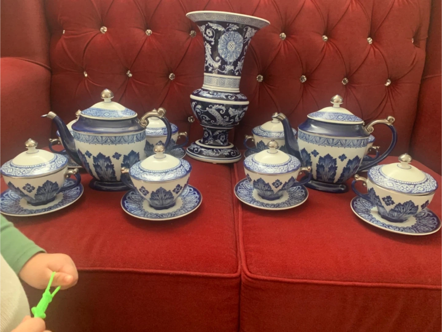 A vintage-style porcelain tea set featuring two teapots, six cups and saucers, and lids. Includes a matching decorative vase. Features a classic blue and white floral pattern.